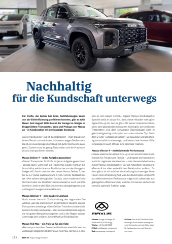 122 35 BEST OF BEST OF Portrait xxx Region Brugg-Windisch Nachhaltig f%u00fcr die Kundschaft unterwegsF%u00fcr Profi s, die bisher bei ihren Nutzfahrzeugen kaum von der Elektrifi zierung profi tieren konnten, gibt es tolle News: Seit August 2024 bietet die Garage im Steiger in Brugg Elektro-Transporter, Vans und Pickups von Maxus an %u2013 in Kombination mit erstklassiger Beratung.So ein Handwerker-Tag ist durchgetaktet %u2013 man braust von einem Termin zum n%u00e4chsten, in %u00e4usserst engen Zeitfenstern. Da ist ein zuverl%u00e4ssiges Fahrzeug mit guter Reichweite zwingend. Zudem muss es genug Platz bieten und ein Maximum an Last transportieren k%u00f6nnen.Maxus Deliver 7 %u2013 jeder Aufgabe gewachsen%u00abDieser Transporter f%u00fcr Profi s ist jeder Aufgabe gewachsen %u2013 gerade dann, wenn sich die Fracht mal wieder nicht an die Norm h%u00e4lt%u00bb, erkl%u00e4rt Markus Rindlisbacher von der Garage im Steiger AG. Damit meint er den neuen Maxus Deliver 7, der bis zu 6,7%u00a0Kubik Laderaum und 1,125 Tonnen Nutzlast bietet. %u00abMit seinem behaglichen Cockpit, dem modernen Infotainment oder der R%u00fcckfahr-Kamera bietet er auch viel PWKomfort%u00bb, lenkt er den Blick ins Interieur des gediegenen und umfangreich ausgestatteten B%u00fcezers.Maxus eDeliver 7 %u2013 eine saubere LeistungNoch immer herrscht Zur%u00fcckhaltung des regionalen Gewerbes, was die elektronisch angetriebene Variante dieses Transporters anbelangt. %u00abDer eDeliver 7 w%u00fcrde sich jedenfalls bestens f%u00fcr alle Handwerker- oder Gemeindebetriebe eignen, die mit gutem Beispiel vorangehen und in der Region sauber unterwegs sein wollen%u00bb, betont Markus Rindlisbacher.Maxus T60 Max %u2013 ein Pick-up f%u00fcr alle F%u00e4lle%u00abBei anspruchsvollen Gewerbe-Eins%u00e4tzen ebenfalls ein zuverl%u00e4ssiger Begleiter ist der Maxus T60 Max, der bis 3,5%u00a0Tonnen an den Haken nimmt%u00bb, erg%u00e4nz Markus Rindlisbacher. Speziell weist er darauf hin, dass dieser Allradler %u00abder g%u00fcnstigste Pick-up ist, den es gibt.%u00bb Mit seiner markanten Karosserie, dem gl%u00e4nzenden schwarzen K%u00fchlergrill, den seitlichen Trittbrettern und dem schwarzen %u00dcberrollb%u00fcgel sieht er gleichzeitig kernig und stylish aus %u2013 ein robuster Typ. Dank dem 2-Liter-Turbodiesel ist der T60 souver%u00e4n und gleichzeitig wirtschaftlich unterwegs, und bietet dank hinterer Differenzialsperre auch offroad eine optimale Traktion.Maxus eTerron 9 %u2013 elektrisierende Performance%u00abDieser elektrische Allrad-Pick-up ist ein komfortabler Lademeister f%u00fcr Freizeit und Familie %u2013 und eignet sich besonders auch f%u00fcr regionale Handwerker %u2013 oder Gemeindebetriebe%u00bb, meint Markus Rindlisbacher. Der als Arbeitstier konzipierte eTerron 9 hat allen erdenklichen PW-Komfort an Bord. Zudem gl%u00e4nzt er mit sch%u00f6ner Verarbeitung hochwertiger Materialien. Die Fahrleistung h%u00e4lt, was die starke Optik verspricht: zur elektrisierenden Perfomance tr%u00e4gt nicht zuletzt das ausgekl%u00fcgelte Luftfahrwerk bei, welches mit seinen sechs Modi stets f%u00fcr optimale Traktion sorgt.Adresse: Garage im Steiger AGBadstrasse 50, 5200 BruggTelefon: +41 56 448 98 00E-Mail: info@garage-imsteiger.chWeb: www.garage-imsteiger.chIn K%u00fcrze: Das ist die Zukunft der Nutzfahrzeuge. Maxus bietet Fahrzeuge mit mehr Reichwelte und mehr Platz. Ideal f%u00fcr Handwerker:innen und Unternehmer:innen.
