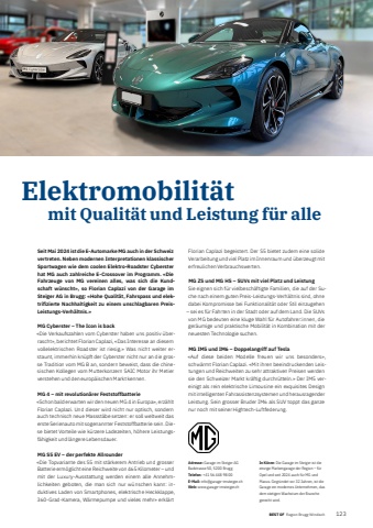 BEST OF Region Brugg-Windisch BEST OF Portrait xxx 12336Elektromobilit%u00e4t mit Qualit%u00e4t und Leistung f%u00fcr alleSeit Mai 2024 ist die E-Automarke MG auch in der Schweiz vertreten. Neben modernen Interpretationen klassischer Sportwagen wie dem coolen Elektro-Roadster Cyberster hat MG auch zahlreiche E-Crossover im Programm. %u00abDie Fahrzeuge von MG vereinen alles, was sich die Kundschaft w%u00fcnscht%u00bb, so Florian Caplazi von der Garage im Steiger AG in Brugg: %u00abHohe Qualit%u00e4t, Fahrspass und elektrifi zierte Nachhaltigkeit zu einem unschlagbaren PreisLeistungs-Verh%u00e4ltnis.%u00bbMG Cyberster %u2013 The Icon is back%u00abDie Verkaufszahlen vom Cyberster haben uns positiv %u00fcberrascht%u00bb, berichtet Florian Caplazi, %u00abDas Interesse an diesem vollelektrischen Roadster ist riesig.%u00bb Was nicht weiter erstaunt, immerhin kn%u00fcpft der Cyberster nicht nur an die grosse Tradition vom MG B an, sondern beweist, dass die chinesischen Kollegen vom Mutterkonzern SAIC Motor ihr Metier verstehen und den europ%u00e4ischen Markt kennen.MG 4 %u2013 mit revolution%u00e4rer Feststoffbatterie%u00abSchon bald erwarten wir den neuen MG 4 in Europa%u00bb, erz%u00e4hlt Florian Caplazi. Und dieser wird nicht nur optisch, sondern auch technisch neue Massst%u00e4be setzen: er soll weltweit das erste Serienauto mit sogenannter Feststoffbatterie sein. Diese bietet Vorteile wie k%u00fcrzere Ladezeiten, h%u00f6here Leistungsf%u00e4higkeit und l%u00e4ngere Lebensdauer.MG S5 EV %u2013 der perfekte Allrounder%u00abDie Topvariante des S5 mit st%u00e4rkerem Antrieb und grosser Batterie erm%u00f6glicht eine Reichweite von 465 Kilometer %u2013 und mit der Luxury-Ausstattung werden einem alle Annehmlichkeiten geboten, die man sich nur w%u00fcnschen kann: induktives Laden von Smartphones, elektrische Heckklappe, 360-Grad-Kamera, W%u00e4rmepumpe und vieles mehr%u00bb erkl%u00e4rt Florian Caplazi begeistert. Der S5 bietet zudem eine solide Verarbeitung und viel Platz im Innenraum und %u00fcberzeugt mit erfreulichen Verbrauchswerten.MG ZS und MG HS %u2013 SUVs mit viel Platz und LeistungSie eignen sich f%u00fcr vielbesch%u00e4ftigte Familien, die auf der Suche nach einem guten Preis-Leistungs-Verh%u00e4ltnis sind, ohne dabei Kompromisse bei Funktionalit%u00e4t oder Stil einzugehen %u2013 sei es f%u00fcr Fahrten in der Stadt oder auf dem Land. Die SUVs von MG bedeuten eine kluge Wahl f%u00fcr Autofahrer:innen, die ger%u00e4umige und praktische Mobilit%u00e4t in Kombination mit der neuesten Technologie suchen.MG IM5 und IM6 %u2013 Doppelangriff auf Tesla%u00abAuf diese beiden Modelle freuen wir uns besonders%u00bb, schw%u00e4rmt Florian Caplazi. %u00abMit ihren beeindruckenden Leistungen und Reichweiten zu sehr attraktiven Preisen werden sie den Schweizer Markt kr%u00e4ftig durchr%u00fctteln.%u00bb Der IM5 vereinigt als rein elektrische Limousine ein exquisites Design mit intelligenten Fahrassistenzsystemen und herausragender Leistung. Sein grosser Bruder IM6 als SUV toppt das ganze nur noch mit seiner Hightech-Luftfederung.Adresse: Garage im Steiger AGBadstrasse 50, 5200 BruggTelefon: +41 56 448 98 00E-Mail: info@garage-imsteiger.chWeb: www.garage-imsteiger.chIn K%u00fcrze: Die Garage im Steiger ist die einzige Markengarage der Region %u2013 f%u00fcr Opel und seit 2024 auch f%u00fcr MG und Maxus. Gegr%u00fcndet vor 32 Jahren, ist die Garage ein modernes Unternehmen, das dem stetigen Wachstum der Branche gerecht wird.