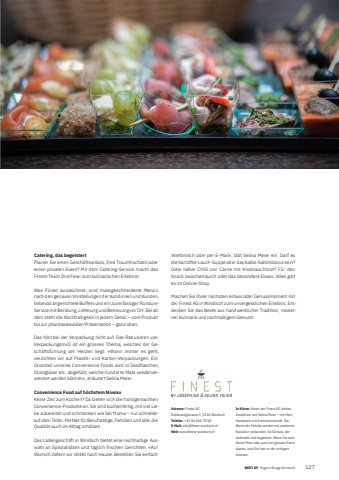 BEST OF Region Brugg-Windisch BEST OF Portrait xxx 1278Adresse: Finest AGDohlenzelgstrasse 3, 5210 WindischTelefon: +41 56 566 70 50E-Mail: info@fi nest-windisch.chWeb: www.fi nest-windisch.chIn K%u00fcrze: Hinter der Finest AG stehen Josephine und Selina Meier %u2013 mit Herz, Handwerk und Innovationskraft. Die Werte der Familie werden mit moderner Esskultur verbunden, f%u00fcr Genuss, der verbindet und begeistert. Wenn Sie eine kleine Feier oder auch ein grosses Event planen, sind Sie hier an der richtigen Adresse.Catering, das begeistertPlanen Sie einen Gesch%u00e4ftsanlass, Ihre Traumhochzeit oder einen privaten Event? Mit dem Catering-Service macht das Finest-Team Ihre Feier zum kulinarischen Erlebnis!Was Finest auszeichnet, sind massgeschneiderte Men%u00fcs nach den genauen Vorstellungen der Kundinnen und Kunden, liebevoll angerichtete Buffets und ein zuverl%u00e4ssiger RundumService mit Beratung, Lieferung und Betreuung vor Ort. Bei all dem steht die Nachhaltigkeit in jedem Detail %u2013 vom Produkt bis zur phantasiesvollen Pr%u00e4sentation %u2013 ganz oben.Das h%u00f6rt bei der Verpackung nicht auf. Das Reduzieren von Verpackungsm%u00fcll ist ein grosses Thema, welches der Gesch%u00e4ftsf%u00fchrung am Herzen liegt. %u00abWann immer es geht, verzichten wir auf Plastik- und Karton-Verpackungen. Ein Grossteil unseres Convenience Foods wird in Glasflaschen, Stutzgl%u00e4ser etc. abgef%u00fcllt, welche hunderte Male wiederverwendet werden k%u00f6nnen%u00bb, erl%u00e4utert Selina Meier.Convenience Food auf h%u00f6chstem NiveauKeine Zeit zum Kochen? Da bieten sich die handgemachten Convenience-Produkte an. Sie sind k%u00fcchenfertig, mit viel Liebe zubereitet und schmecken wie bei Mama %u2013 nur schneller auf dem Teller. Perfekt f%u00fcr Berufst%u00e4tige, Familien und alle, die Qualit%u00e4t auch im Alltag sch%u00e4tzen.Das Ladengesch%u00e4ft in Windisch bietet eine reichhaltige Auswahl an Spezialit%u00e4ten und t%u00e4glich frischen Gerichten. %u00abAuf Wunsch liefern wir direkt nach Hause. Bestellen Sie einfach telefonisch oder per E-Mail%u00bb, l%u00e4dt Selina Meier ein. Darf es die Kartoffel-Lauch-Suppe oder das Kalbs-Saltimbocca sein? Oder lieber Chilli con Carne mit Knoblauchbrot? F%u00fcr den Snack zwischendurch oder das besondere Etwas: Alles gibt es im Online-Shop.Machen Sie Ihren n%u00e4chsten Anlass oder Genussmoment mit der Finest AG in Windisch zum unvergesslichen Erlebnis. Entdecken Sie das Beste aus handwerklicher Tradition, moderner Kulinarik und nachhaltigem Genuss!