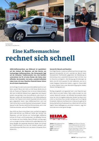 BEST OF Region Brugg-Windisch BEST OF Portrait xxx 12942HIMA-Kaffeemaschinen aus R%u00fcfenach ist spezialisiert auf den Verkauf, die Reparatur und den Service von hochwertigen Kaffeemaschinen. Der Schwerpunkt liegt auf der Schweizer Traditionsmarke Jura. Das Familienunternehmen hat f%u00fcr all seine Marken den Status einer offi ziellen Servicestelle. Und weiss, weshalb Kaffeeliebhaber:innen mit einer Maschine fi nanziell besser fahren als mit einem Kapselsystem.Auf die Frage, f%u00fcr wenn sich eine echte Kaffeemaschine noch lohnt, spricht Marco Hirt nicht um die heisse Br%u00fche herum. %u00abAb vier Tassen pro Tag spart man mit einem Vollautomaten, den man mit Bohnen beladen kann, gegen%u00fcber dem Kapselsystem, das g%u00fcnstig in der Anschaffung ist, aber teurer im Betrieb%u00bb, erkl%u00e4rt der Gesch%u00e4ftsf%u00fchrer von HIMA-Kaffeemaschinen. Vier Tassen sind in einem Haushalt schnell erreicht, ganz abgesehen davon, dass Kaffeemaschinen noch viel mehr k%u00f6nnen als nur einen Espresso herauszulassen: heisses Wasser f%u00fcr den Tee oder s%u00e4mtliche Milchprodukte, auch in der Coldbrew Variante, was auch Teenies begeistert.Das 1995 von Marco Hirts Eltern Lotti und Rolf Hirt gegr%u00fcndete Unternehmen aus R%u00fcfenach bietet den Verkauf, die Reparatur und den Service von hochwertigen Kaffeemaschinen f%u00fcr Privat- und Firmenkunden. Als offi zieller Partner von Marken wie Jura, Melitta, Saeco (Philips) und DeLonghi, um nur einige zu nennen, fi ndet sich f%u00fcr jedes Bed%u00fcrfnis und jedes Budget die passende Maschine. Wobei die Schweizer Traditionsmarke Jura klar am meisten verkauft wird. Unterst%u00fctzung erh%u00e4lt Marco Hirt von seiner Schwester Doris M%u00fcller Hirt. Eine Kaffeemaschine rechnet sich schnellService f%u00fcr Mensch und MaschineDie M%u00f6glichkeiten moderner Kaffeemaschinen bringen eine gewisse Komplexit%u00e4t mit sich, weshalb der Besuch beim kompetenten Fachh%u00e4ndler gegen%u00fcber der Bestellung im Online shop einen wesentlich besseren Start mit ihrer neuen Maschine erm%u00f6glicht. %u00abDie Reinigungs-Einstellungen ab Werk sind oft nicht passend f%u00fcr den Kalkanteil, den wir in vielen Aargauer Gemeinden haben%u00bb, sagt Hirt. Diese stellt er seinen K%u00e4ufer:innen unter Ber%u00fccksichtigung des lokalen Wasser-H%u00e4rtegrades ein.Richtig eingestellt und gewartet kann eine Maschine gut zehn Jahre und mehr halten. Daf%u00fcr sollte sie aber hin und wieder %u00fcberpr%u00fcft werden. Als offi zielle Servicestelle s%u00e4mtlicher bei ihm im Angebot stehender Marken hat Marco Hirt nicht nur das Know-how, sondern verbaut auch nur OriginalErsatzteile. W%u00e4hrend die Maschine im Service ist, gibt es f%u00fcr die Kundschaft eine Ersatzmaschine. %u00abDamit sie nicht auf ihre t%u00e4glich Dosis Kaffeegenuss verzichten m%u00fcssen%u00bb, sagt Hirt. Auch das wie in einer guten Garage.Adresse: HIMA-KaffeemaschinenKirchweg 3, 5235 R%u00fcfenachTelefon: +41 56 284 22 32E-Mail: info@hima.ch Web: www.hima.ch In K%u00fcrze: Unser Ziel ist es, Ihnen die besten Kaffeemaschinen und Zubeh%u00f6r anzubieten, um Ihr Kaffeeerlebnis auf ein ganz neues Niveau zu heben. Unsere Leidenschaft f%u00fcr Kaffee und unser Engagement f%u00fcr Qualit%u00e4t sind in allem, was wir tun, sp%u00fcrbar.Die Geschwister: Doris M%u00fcller Hirt und Marco Hirt