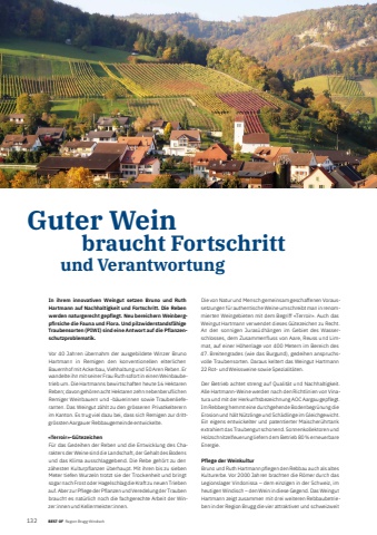 132 2 BEST OF BEST OF Region Brugg und Windisch Region Brugg-WindischGuter Wein braucht Fortschritt und VerantwortungIn ihrem innovativen Weingut setzen Bruno und Ruth Hartmann auf Nachhaltigkeit und Fortschritt. Die Reben werden naturgerecht gepflegt. Neu bereichern Weinbergpfi rsiche die Fauna und Flora. Und pilzwiderstandsf%u00e4hige Traubensorten (PIWI) sind eine Antwort auf die Pflanzenschutzproblematik.Vor 40%u00a0Jahren %u00fcbernahm der ausgebildete Winzer Bruno Hartmann in Remigen den konventionellen elterlichen Bauern hof mit Ackerbau, Viehhaltung und 50%u00a0Aren Reben. Er wandelte ihn mit seiner Frau Ruth sofort in einen Weinbaubetrieb um. Die Hartmanns bewirtschaften heute 16%u00a0Hektaren Reben; davon geh%u00f6ren acht Hektaren zehn nebenberuflichen Remiger Weinbauern und -b%u00e4uerinnen sowie Traubenlieferanten. Das Weingut z%u00e4hlt zu den gr%u00f6sseren Privatkelterern im Kanton. Es trug viel dazu bei, dass sich Remigen zur drittgr%u00f6ssten Aargauer Rebbaugemeinde entwickelte. %u00abTerroir%u00bb-G%u00fctezeichenF%u00fcr das Gedeihen der Reben und die Entwicklung des Charakters der Weine sind die Landschaft, der Gehalt des Bodens und das Klima ausschlaggebend. Die Rebe geh%u00f6rt zu den z%u00e4hesten Kulturpflanzen %u00fcberhaupt. Mit ihren bis zu sieben Meter tiefen Wurzeln trotzt sie der Trockenheit und bringt sogar nach Frost oder Hagelschlag die Kraft zu neuen Trieben auf. Aber zur Pflege der Pflanzen und Veredelung der Trauben braucht es nat%u00fcrlich noch die fachgerechte Arbeit der Winzer:innen und Kellermeister:innen. Die von Natur und Mensch gemeinsam geschaffenen Voraussetzungen f%u00fcr authentische Weine umschreibt man in renommierten Weingebieten mit dem Begriff %u00abTerroir%u00bb. Auch das Weingut Hartmann verwendet dieses G%u00fctezeichen zu Recht. An den sonnigen Juras%u00fcdh%u00e4ngen im Gebiet des Wasserschlosses, dem Zusammenfluss von Aare, Reuss und Limmat, auf einer H%u00f6henlage von 400%u00a0Metern im Bereich des 47.%u00a0Breitengrades (wie das Burgund), gedeihen anspruchsvolle Traubensorten. Daraus keltert das Weingut Hartmann 22%u00a0Rot- und Weissweine sowie Spezialit%u00e4ten.Der Betrieb achtet streng auf Qualit%u00e4t und Nachhaltigkeit. Alle Hartmann-Weine werden nach den Richtlinien von Vinatura und mit der Herkunftsbezeichnung AOC Aargau gepflegt. Im Rebberg hemmt eine durchgehende Bodenbegr%u00fcnung die Erosion und h%u00e4lt N%u00fctzlinge und Sch%u00e4dlinge im Gleichgewicht. Ein eigens entwickelter und patentierter Maischer%u00fchrtank extrahiert das Traubengut schonend. Sonnenkollektoren und Holzschnitzelfeuerung liefern dem Betrieb 80 % erneuerbare Energie. Pflege der WeinkulturBruno und Ruth Hartmann pflegen den Rebbau auch als altes Kulturerbe. Vor 2000%u00a0Jahren brachten die R%u00f6mer durch das Legionslager Vindonissa %u2013 dem einzigen in der Schweiz, im heutigen Windisch %u2013 den Wein in diese Gegend. Das Weingut Hartmann zeigt zusammen mit drei weiteren Rebbaubetrieben in der Region Brugg die vier attraktiven und schweizweit