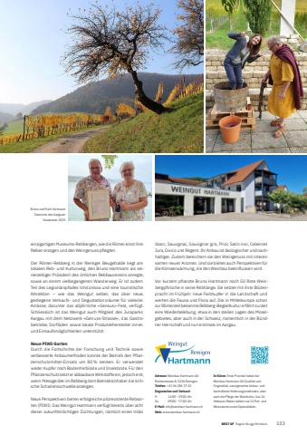 BEST OF BEST OFRegion Brugg und Windisch Region Brugg-Windisch 13324einzigartigen Museums-Rebbergen, wie die R%u00f6mer einst ihre Reben erzogen und den Weingenuss pflegten. Der R%u00f6mer-Rebberg in der Remiger Beugehalde liegt am lokalen Reb- und Kulturweg, den Bruno Hartmann als seinerzeitiger Pr%u00e4sident des %u00f6rtlichen Rebbauvereins anregte, sowie an einem vielbegangenen Wanderweg. Er ist zudem Teil des Legion%u00e4rspfades Vindonissa und eine touristische Attraktion %u2013 wie das Weingut selber, das %u00fcber neue, gediegene Verkaufs- und Degustationsr%u00e4ume f%u00fcr vielerlei Anl%u00e4sse, darunter das allj%u00e4hrliche %u00abSensus%u00bb-Fest, verf%u00fcgt. Schliesslich ist das Weingut auch Mitglied des Juraparks Aargau mit dem Netzwerk %u00abGenuss-Strasse%u00bb, das Gastrobetriebe, Dorfl%u00e4den sowie lokale Produktehersteller:innen und Einkaufsm%u00f6glichkeiten unterst%u00fctzt.Neue PIWI-SortenDurch die Fortschritte der Forschung und Technik sowie verbesserte Anbaumethoden konnte der Betrieb den Pflanzenschutzmittel-Einsatz um 80 % senken. Er verwendet weder Kupfer noch Bodenherbizide und Insektizide. F%u00fcr den Pflanzenschutz setzt er abbaubare Wirkstoffe ein, jedoch erst, wenn Messger%u00e4te im Rebberg dem Betriebsinhaber die kritische Schadensschwelle anzeigen. Neue Perspektiven bieten erfolgreiche pilzresistente Rebsorten (PIWI). Das Weingut Hartmann verf%u00fcgt bereits %u00fcber acht dieser zukunftstr%u00e4chtigen Z%u00fcchtungen, n%u00e4mlich einen Vidal blanc, Sauvignac, Souvignier gris, Prior, Satin noir, Cabernet Jura, Divico und Regent. Ihr Anbau ist %u00f6kologischer und nachhaltiger. Zudem bereichern sie den Weingenuss mit interessanten neuen Aromen. Und sie bieten auch Perspektiven f%u00fcr die Klima erw%u00e4rmung, die den Weinbau beeinflussen wird. Vor kurzem pflanzte Bruno Hartmann noch 50%u00a0Rote Weinbergpfi rsiche in seine Rebh%u00e4nge. Sie setzen mit ihrer Bl%u00fctenpracht im Fr%u00fchjahr neue Farbtupfer in die Landschaft und werten die Fauna und Flora auf. Die in Mitteleuropa schon zur R%u00f6merzeit bekannte Rebberg-Begleitkultur erf%u00e4hrt zurzeit eine Wiederbelebung, etwa in den steilen Lagen des Moselgebietes, aber auch in der Schweiz, namentlich in der B%u00fcndner Herrschaft und nun erstmals im Aargau.Adresse: Weinbau Hartmann AGRinikerstrasse 8, 5236 RemigenTelefon: +41 56 284 27 43Degustation und Verkauf: Fr 14.00 %u2013 19.00 UhrSa 09.00 %u2013 17.00 Uhr E-Mail: info@weinbau-hartmann.chWeb: www.weinbau-hartmann.chIn K%u00fcrze: Erste Priorit%u00e4t haben bei Weinbau Hartmann AG Qualit%u00e4t und Originalit%u00e4t, naturgerechte Anbau- und kontrollierte Kelterungsmethoden, aber auch die Pflege der Weinkultur. Aus 16 Hektaren Reben keltern sie 22 Rot- und Weissweine sowie Spezialit%u00e4ten.Bruno und Ruth Hartmann Gewinner des Aargauer Staatswein 2025