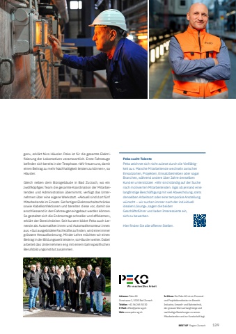 BEST OF BEST OF Region Zurzach Portrait xxx 1392Peko sucht TalentePeko zeichnet sich nicht zuletzt durch die Vielf%u00e4ltigkeit aus. Manche Mitarbeitende wechseln zwischen Einsatzorten, Projekten, Einsatzbetrieben oder sogar Branchen, w%u00e4hrend andere %u00fcber Jahre denselben Kunden unterst%u00fctzen. %u00abWir sind st%u00e4ndig auf der Suche nach motivierten Mitarbeitenden. Egal ob jemand eine langfristige Besch%u00e4ftigung mit viel Abwechslung, stets denselben Arbeitsort oder eine tempor%u00e4re Anstellung w%u00fcnscht %u2013 wir suchen immer nach der individuell idealen L%u00f6sung%u00bb, sagen die beiden Gesch%u00e4ftsf%u00fchrer und laden Interessierte ein, sich zu bewerben.Hier fi nden Sie alle offenen Stellen.Adresse: Peko AGOcostrasse 1, 5330 Bad ZurzachTelefon: +41 56 265 50 30E-Mail: offi ce@peko-ag.chWeb: www.peko-ag.chIn K%u00fcrze: Die Peko AG ist ein Personalund Projektdienstleister im Bereich Industrie, Umwelt- und Bahntechnik, der grossen Wert auf langfristige und nachhaltige Beziehungen zu seinen Mitarbeitenden und zur Kundschaft legt. gen%u00bb, erkl%u00e4rt Nico H%u00e4usler. Peko ist f%u00fcr die gesamte Elektrifi zierung der Lokomotiven verantwortlich. Erste Fahrzeuge befi nden sich bereits in der Testphase. %u00abWir freuen uns, damit einen Beitrag zu mehr Nachhaltigkeit leisten zu k%u00f6nnen%u00bb, so H%u00e4usler. Gleich neben dem B%u00fcrogeb%u00e4ude in Bad Zurzach, wo ein zw%u00f6lfk%u00f6pfi ges Team die gesamte Koordination der Mitarbeitenden und Administration %u00fcbernimmt, verf%u00fcgt das Unternehmen %u00fcber eine eigene Werkstatt. %u00abAktuell sind dort f%u00fcnf Mitarbeitende im Einsatz. Sie fertigen Elektroschaltschr%u00e4nke sowie Kabelkonfektionen und bereiten diese vor, damit sie anschliessend in den Fahrzeugen eingebaut werden k%u00f6nnen. So gestaltet sich die Endmontage schneller und effi zienter%u00bb, erkl%u00e4rt der Bereichsleiter. Seit kurzem bildet Peko auch Lernende als Automatiker:innen und Automatikmonteur:innen aus. %u00abGut ausgebildete Fachkr%u00e4fte zu fi nden, wird eine immer gr%u00f6ssere Herausforderung. Mit der Lehre m%u00f6chten wir einen Beitrag in der Bildungswelt leisten%u00bb, so H%u00e4usler weiter. Dabei arbeitet das Unternehmen eng mit einem bahnspezifi schen Berufs bildungsinstitut zusammen.