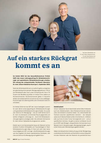 144 BEST OF Portrait xxxAuf ein starkes R%u00fcckgrat kommt es anIm Herbst 2024 hat das Gesundheitszentrum Fricktal (GZF) den neuen Leistungsauftrag f%u00fcr Wirbels%u00e4ulenchirurgie und spezialisierte Wirbels%u00e4ulenchirurgie erhalten. Die Leitung des entsprechenden Fachteams %u00fcbernahm Dr. med. Johann-Sebastian Kunst per 1. September 2025. Dank der Wirbels%u00e4ule k%u00f6nnen wir aufrecht gehen und geniessen gleichzeitig einen grossen Bewegungsspielraum. Oft ist die Wirbels%u00e4ule aber auch unser Schwachpunkt. Rund 70 Prozent der Bev%u00f6lkerung leiden im Verlauf ihres Lebens an R%u00fcckenschmerzen. R%u00fcckenschmerzen gelten in Industriel%u00e4ndern als Volkskrankheit und k%u00f6nnen durch ihre vielf%u00e4ltigen Auswirkungen die Lebensqualit%u00e4t unter Umst%u00e4nden stark einschr%u00e4nken.Im Herbst 2024 hat das GZF den neuen bedingten (vorerst f%u00fcr zwei Jahre) Leistungsauftrag f%u00fcr Wirbels%u00e4ulenchirurgie und spezialisierte Wirbels%u00e4ulenchirurgie erhalten. So wurde das %u00abZentrum f%u00fcr Bewegung%u00bb %u2013 das vor zw%u00f6lf Jahren durch Dr. med. Urs Genewein und Andreas Maurer gegr%u00fcndet und seither erfolgreich unterwegs ist %u2013 durch die Wirbels%u00e4ulenchirurgie erg%u00e4nzt und abgerundet. Als Leitender Arzt konnte Dr. med. Johann-Sebastian Kunst gewonnen werden.Zuletzt war er am Kantonsspital Aarau als Oberarzt mit besonderer Funktion Orthop%u00e4die und Traumatologie im Team Wirbels%u00e4ulenchirurgie t%u00e4tig. Er freut sich sehr %u00fcber seine neue Aufgabe am GZF und sagt: %u00abDie Wirbels%u00e4ulenchirurgie war das Angebot mit einem spezialisierten Fachteam, welches am Zentrum f%u00fcr Bewegung noch gefehlt hat.%u00bb DetektivarbeitJohann-Sebastian Kunst beschreibt seinen Beruf teilweise auch als %u00abDetektivarbeit%u00bb. Denn R%u00fcckenschmerzen k%u00f6nnen viele verschiedene Ursachen haben. So unterscheidet der Facharzt zwischen spezifi schem Schmerz %u2013 der beispielweise durch Bandscheibenvorfall, Knochenbruch, Infektion oder auch durch einen Tumor hervorgerufen wird %u2013 und unspezifi schem Schmerz. Da gibt es keinen sichtbaren Grund durch MRT oder R%u00f6ntgen. Unspezifi scher Schmerz kann zum Beispiel durch Verspannungen, Bewegungsmangel, psychischen Stress oder %u00dcberlastung ausgel%u00f6st werden.Neben der k%u00f6rperlichen Untersuchung und der R%u00f6ntgendiagnostik kl%u00e4ren die Fach%u00e4rzte und Fach%u00e4rztin in einem Gespr%u00e4ch mit dem Patienten oder der Patientin die pers%u00f6nliche KranBeispiel f%u00fcr eine konservative Schmerztherapie. Das Team %u00abWirbels%u00e4ule%u00bb mit Dr. med. Johann-Sebastian Kunst, Dr. med. Helen Bumann und Dr. med. Gernot Lehmann (v. l.).BEST OF Region Fricktal-Rheinfelden