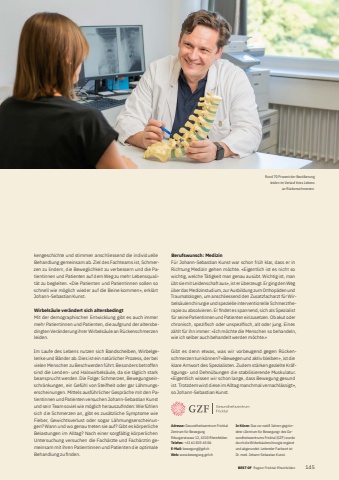 BEST OF Portrait xxx 1452kengeschichte und stimmen anschliessend die individuelle Behandlung gemeinsam ab. Ziel des Fachteams ist, Schmerzen zu lindern, die Beweglichkeit zu verbessern und die Patientinnen und Patienten auf dem Weg zu mehr Lebensqualit%u00e4t zu begleiten. %u00abDie Patienten und Patientinnen sollen so schnell wie m%u00f6glich wieder auf die Beine kommen%u00bb, erkl%u00e4rt Johann-Sebastian Kunst.Wirbels%u00e4ule ver%u00e4ndert sich altersbedingtMit der demographischen Entwicklung gibt es auch immer mehr Patientinnen und Patienten, die aufgrund der altersbedingten Ver%u00e4nderung ihrer Wirbels%u00e4ule an R%u00fcckenschmerzen leiden. Im Laufe des Lebens nutzen sich Bandscheiben, Wirbelgelenke und B%u00e4nder ab. Dies ist ein nat%u00fcrlicher Prozess, der bei vielen Menschen zu Beschwerden f%u00fchrt. Besonders betroffen sind die Lenden- und Halswirbels%u00e4ule, da sie t%u00e4glich stark beansprucht werden. Die Folge: Schmerzen, Bewegungseinschr%u00e4nkungen, ein Gef%u00fchl von Steifheit oder gar L%u00e4hmungserscheinungen. Mittels ausf%u00fchrlicher Gespr%u00e4che mit den Patientinnen und Patienten versuchen Johann-Sebastian Kunst und sein Team soviel wie m%u00f6glich herauszufi nden: Wie f%u00fchlen sich die Schmerzen an, gibt es zus%u00e4tzliche Symptome wie Fieber, Gewichtsverlust oder sogar L%u00e4hmungserscheinungen? Wann und wo genau treten sie auf? Gibt es k%u00f6rperliche Belastungen im Alltag? Nach einer sorgf%u00e4ltig k%u00f6rperlichen Untersuchung versuchen die Fach%u00e4rzte und Fach%u00e4rztin gemeinsam mit ihren Patientinnen und Patienten die optimale Behandlung zu fi nden.Berufswunsch: MedizinF%u00fcr Johann-Sebastian Kunst war schon fr%u00fch klar, dass er in Richtung Medizin gehen m%u00f6chte. %u00abEigentlich ist es nicht so wichtig, welche T%u00e4tigkeit man genau aus%u00fcbt. Wichtig ist, man %u00fcbt sie mit Leidenschaft aus%u00bb, ist er %u00fcberzeugt. Er ging den Weg %u00fcber das Medizinstudium, zur Ausbildung zum Orthop%u00e4den und Traumatologen, um anschliessend den Zusatzfacharzt f%u00fcr Wirbels%u00e4ulenchirurgie und spezielle interventionelle Schmerztherapie zu absolvieren. Er fi ndet es spannend, sich als Spezialist f%u00fcr seine Patientinnen und Patienten einzusetzen. Ob akut oder chronisch, spezifi sch oder unspezifi sch, alt oder jung. Eines z%u00e4hlt f%u00fcr ihn immer: %u00abIch m%u00f6chte die Menschen so behandeln, wie ich selber auch behandelt werden m%u00f6chte.%u00bbGibt es denn etwas, was wir vorbeugend gegen R%u00fcckenschmerzen tun k%u00f6nnen? %u00abBewegen und aktiv bleiben%u00bb, ist die klare Antwort des Spezialisten. Zudem st%u00e4rken gezielte Kr%u00e4ftigungs- und Dehn%u00fcbungen die stabilisierende Muskulatur. %u00abEigentlich wissen wir schon lange, dass Bewegung gesund ist. Trotzdem wird diese im Alltag manchmal vernachl%u00e4ssigt%u00bb, so Johann-Sebastian Kunst.Adresse: Gesundheitszentrum FricktalZentrum f%u00fcr BewegungRiburgerstrasse 12, 4310 RheinfeldenTelefon: +41 61 835 65 06E-Mail: bewegung@gzf.chWeb: www.bewegung.gzf.chIn K%u00fcrze: Das vor zw%u00f6lf Jahren gegr%u00fcndete %u00abZentrum f%u00fcr Bewegung%u00bb des Gesundheitszentrums Fricktal (GZF) wurde durch die Wirbels%u00e4ulenchirurgie erg%u00e4nzt und abgerundet. Leitender Facharzt ist Dr. med. Johann-Sebastian Kunst.Rund 70 Prozent der Bev%u00f6lkerung leiden im Verlauf ihres Lebens an R%u00fcckenschmerzen.BEST OF Region Fricktal-Rheinfelden