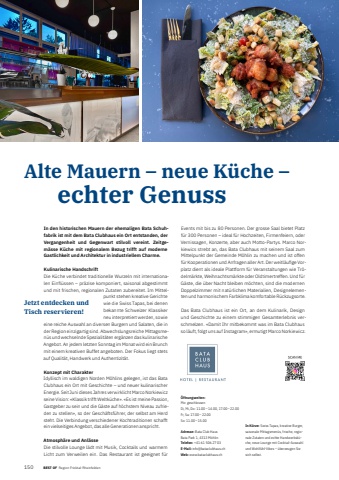 150 BEST OF BEST OF Portrait xxx Region Fricktal-RheinfeldenAlte Mauern %u2013 neue K%u00fcche %u2013 echter Genuss%u00d6ffnungszeiten:Mo: geschlossenDi, Mi, Do: 11.00 %u2013 14.00, 17.00 %u2013 22.00Fr, Sa: 17.00 %u2013 22.00So: 11.00 %u2013 15.00Adresse: Bata Club HausBata Park 1, 4313 M%u00f6hlinTelefon: +41 61 506 27 03 E-Mail: info@bataclubhaus.chWeb: www.bataclubhaus.chIn K%u00fcrze: Swiss Tapas, kreative Burger, saisonale Mittagsmen%u00fcs, frische, regionale Zutaten und echte Handwerksk%u00fcche, neue Lounge mit Cocktail-Auswahl und Wohlf%u00fchl-Vibes %u2013 %u00fcberzeugen Sie sich selbst.In den historischen Mauern der ehemaligen Bata Schuhfabrik ist mit dem Bata Clubhaus ein Ort entstanden, der Vergangenheit und Gegenwart stilvoll vereint. Zeitgem%u00e4sse K%u00fcche mit regionalem Bezug trifft auf moderne Gastlichkeit und Architektur in industriellem Charme. Kulinarische HandschriftDie K%u00fcche verbindet traditionelle Wurzeln mit internationalen Einfl%u00fcssen %u2013 pr%u00e4zise komponiert, saisonal abgestimmt und mit frischen, regionalen Zutaten zubereitet. Im Mittelpunkt stehen kreative Gerichte wie die Swiss Tapas, bei denen bekannte Schweizer Klassiker neu interpretiert werden, sowie eine reiche Auswahl an diversen Burgern und Salaten, die in der Region einzigartig sind. Abwechslungsreiche Mittagsmen%u00fcs und wechselnde Spezialit%u00e4ten erg%u00e4nzen das kulinarische Angebot. An jedem letzten Sonntag im Monat wird ein Brunch mit einem kreativen Buffet angeboten. Der Fokus liegt stets auf Qualit%u00e4t, Handwerk und Authentizit%u00e4t.Konzept mit CharakterIdyllisch im waldigen Norden M%u00f6hlins gelegen, ist das Bata Clubhaus ein Ort mit Geschichte %u2013 und neuer kulinarischer Energie. Seit Juni dieses Jahres verwirklicht Marco Norkiewicz seine Vision: %u00abKlassik trifft Weltk%u00fcche%u00bb. %u00abEs ist meine Passion, Gastgeber zu sein und die G%u00e4ste auf h%u00f6chstem Niveau zufrieden zu stellen%u00bb, so der Gesch%u00e4ftsf%u00fchrer, der selbst am Herd steht. Die Verbindung verschiedener Kochtraditionen schafft ein vielseitiges Angebot, das alle Generationen anspricht.Atmosph%u00e4re und Anl%u00e4sseDie stilvolle Lounge l%u00e4dt mit Musik, Cocktails und warmem Licht zum Verweilen ein. Das Restaurant ist geeignet f%u00fcr Events mit bis zu 80 Personen. Der grosse Saal bietet Platz f%u00fcr 300 Personen %u2013 ideal f%u00fcr Hochzeiten, Firmenfeiern, oder Vernissagen, Konzerte, aber auch Motto-Partys. Marco Norkiewics strebt an, das Bata Clubhaus mit seinem Saal zum Mittelpunkt der Gemeinde M%u00f6hlin zu machen und ist offen f%u00fcr Kooperationen und Anfragen aller Art. Der weitl%u00e4ufi ge Vorplatz dient als ideale Plattform f%u00fcr Veranstaltungen wie Tr%u00f6delm%u00e4rkte, Weihnachtsm%u00e4rkte oder Oldtimertreffen. Und f%u00fcr G%u00e4ste, die %u00fcber Nacht bleiben m%u00f6chten, sind die modernen Doppelzimmer mit nat%u00fcrlichen Materialien, Designelementen und harmonischem Farbklima komfortable R%u00fcckzugsorte.Das Bata Clubhaus ist ein Ort, an dem Kulinarik, Design und Geschichte zu einem stimmigen Gesamterlebnis verschmelzen. %u00abDamit Ihr mitbekommt was im Bata Clubhaus so l%u00e4uft, folgt uns auf Instagram%u00bb, ermutigt Marco Norkiewicz.Jetzt entdecken und Tisch reservieren!