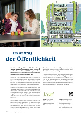 154 8 BEST OF BEST OF Portrait xxx Region Bremgarten-Freiamt Im Auftrag der %u00d6ffentlichkeitAdresse: St. Josef-StiftungBadstrasse 30, 5620 BremgartenTelefon: +41 56 648 45 45E-Mail: info@josef-stiftung.chWeb: www.josef-stiftung.chIn K%u00fcrze: Ziel der St. Josef-Stiftung ist es, den Klientinnen und Klienten ein m%u00f6glichst selbstbestimmtes, in unsere Gesellschaft integriertes Leben zu erm%u00f6glichen. Davon kann die Allgemeinheit als Ganzes profi tieren, wenn sie erkennt, wie wertvoll Inklusion f%u00fcr alle Beteiligten ist.Die St. Josef-Stiftung erf%u00fcllt einen %u00f6ffentlichen Auftrag. Sie bildet, begleitet und unterst%u00fctzt Kinder, Jugendliche und Erwachsene mit haupts%u00e4chlich kognitiven Beeintr%u00e4chtigungen oder anderen Entwicklungsauff%u00e4lligkeiten. Diesen Auftrag erf%u00fcllt die Stiftung seit 1889.Kindern und Jugendlichen mit kognitiven oder mehrfachen Beeintr%u00e4chtigungen gew%u00e4hrleistet die Heilp%u00e4dagogische Schule Bildung und individuelle F%u00f6rderung. K%u00f6nnen Kinder oder Jugendliche aus verschiedenen Gr%u00fcnden nicht bei ihren Angeh%u00f6rigen leben, bietet Josef Wohn- und Entlastungspl%u00e4tze an.Im Erwachsenenbereich umfasst das Angebot von Josef Wohnpl%u00e4tze sowie Arbeiten und Erleben, wo allt%u00e4gliche Besch%u00e4ftigungen, Aktivierung und besondere Erlebnisse erm%u00f6glicht werden. Die Klientel verl%u00e4sst %u2013 nach dem Normalisierungsprinzip %u2013 einmal am Tag die Wohngruppe und nimmt ein Angebot wahr, das ihren Bed%u00fcrfnissen m%u00f6glichst optimal entspricht.Im Bereich Ambulante Kinderangebote sind die heilp%u00e4dagogische Fr%u00fcherziehung, die Logop%u00e4die im Fr%u00fchbereich und die Psychomotorik vereint. Sie betreuen Kinder aus der Region und deren Familien. Diese Unterst%u00fctzung fi ndet zu Hause in der gewohnten Umgebung der Kinder oder in den Ambulatorien in Bremgarten, Muri oder Wohlen statt.Die stiftungsinterne Physio- und Ergotherapie betreut die Klientel von Josef und auch externe Personen in den neuen R%u00e4umlichkeiten des Hauses Allegra.Das weitl%u00e4ufi ge Gel%u00e4nde von Josef bietet viele M%u00f6glichkeiten zum Spielen und Verweilen. Der Tierpark Tipajo erfreut Besuchende jeden Alters. Das einladende Restaurant JoJo ist 365 Tage im Jahr ge%u00f6ffnet und stillt mit seiner Vielfalt die kulinarischen Bed%u00fcrfnisse von Gross und Klein. Seit 2025 steht der Seminarbereich im 7. Stock des Hauses Allegra Firmen und Vereinen f%u00fcr Sitzungen und Tagungen zur Verf%u00fcgung.