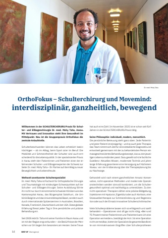 14 BEST OF BEST OF Portrait xxx %u00dcberregional OrthoFokus %u2013 Schulterchirurg und Movemind: interdisziplin%u00e4r, ganzheitlich, bewegendWillkommen in der SCHULTERCHIRURG Praxis f%u00fcr Schulter- und Ellbogenchirurgie Dr. med. Mohy Taha, Aarau. Mit Vertrauen und Innovation steht Ihre Gesundheit im Mittelpunkt. Neu ist die Gruppen praxis OrthoFokus die zentrale Anlaufstelle.Schulterbeschwerden k%u00f6nnen das Leben erheblich beeintr%u00e4chtigen %u2013 ob im Alltag, beim Sport oder im Beruf: Die Mobilit%u00e4t und Schmerzfreiheit der Schulter sind auch entscheidend f%u00fcr die Lebensqualit%u00e4t. In der spezialisierten Praxis in Aarau steht den Patientinnen und Patienten einer der erfahrensten Schulter- und Ellbogenexperten der Schweiz zur Seite: Dr. med. Mohy Taha %u2013 Ihr Partner auf dem Weg zu neuer Beweglichkeit und Lebensfreude.Weltweit anerkannter SchulterspezialistDr. med. Mohy Taha ist Facharzt f%u00fcr Orthop%u00e4dische Chirurgie und Traumatologie mit eindeutigen Schwerpunkten auf der Schulter- und Ellbogenchirurgie. Seine Ausbildung f%u00fchrte ihn nicht nur durch renommierte Schweizer Kliniken wie das Kantonsspital Aarau, das B%u00fcrgerspital Solothurn, die Uniklinik Balgrist und das Universit%u00e4tsspital Basel, sondern auch durch internationale Spitzenzentren in Australien, Brasilien, Kanada, Frankreich, Deutschland und den USA. Diese globale Erfahrung fliesst jeden Tag in Ihre pers%u00f6nliche und pr%u00e4zise Behandlung ein.Seit 2005 lebt Dr. Taha mit seiner Familie im Raum Aarau und ist mit der Region eng verbunden %u2013 die Bed%u00fcrfnisse der Menschen vor Ort liegen ihm besonders am Herzen. Seine Treue hat auch eine Zahl: Im November 2025 ist er schon seit f%u00fcnf Jahren in der SCHULTERCHIRURG Praxis t%u00e4tig.Seine Philosophie: individuell, modern, menschlich.Die pers%u00f6nliche Betreuung steht ganz oben: Jede Patientin und jeder Patient ist einzigartig %u2013 und so auch jede Therapie. Das Team nimmt sich Zeit f%u00fcr eine detaillierte Diagnostik und entwickelt gemeinsam mit der zu behandelnden Person ein massgeschneidertes Behandlungskonzept, das zu den jeweiligen Lebensumst%u00e4nden passt. Dazu gesellt sich die fachliche Exzellenz: Aktuelles Wissen, modernste Technik und jahrelange Erfahrung garantieren eine Versorgung auf h%u00f6chstem Niveau: von der Erstberatung %u00fcber die Therapieplanung bis zur Nachsorge.Gehandelt wird nach einem ganzheitlichen Ansatz: Konservative, nicht-operative Methoden und modernste Operationstechniken werden sinnvoll kombiniert, um die Schultergesundheit optimal und nachhaltig zu unterst%u00fctzen. Zu den nicht-operativen Therapien z%u00e4hlen eine pr%u00e4zise Bildgebung, Injektionen mit Hyaluron, Eigenblut oder auch Kortison, eine Stosswellentherapie zur Schmerzlinderung und Regeneration oder auch der Einsatz innovativer Schulterschrittmacher.Viele Schulterprobleme lassen sich so erfolgreich und sanft behandeln %u2013 Operationen sind oft gar nicht n%u00f6tig. %u00abBei rund 75 Prozent meiner Patientinnen und Patienten kann ich eine Operation vermeiden%u00bb, best%u00e4tigt der Arzt. Ist eine Operation nicht vermeidbar, bietet der Spezialist die gesamte Bandbreite von minimalinvasiven Eingriffen %u00fcber Schulterprothesen Dr. med. Mohy Taha