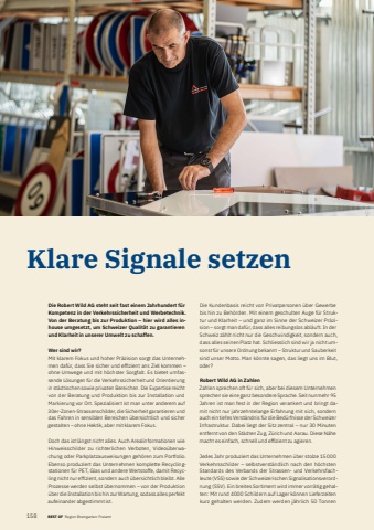 158 24 BEST OF BEST OF Portrait xxx Region Bremgarten-FreiamtKlare Signale setzenDie Robert Wild AG steht seit fast einem Jahrhundert f%u00fcr Kompetenz in der Verkehrssicherheit und Werbetechnik. Von der Beratung bis zur Produktion %u2013 hier wird alles inhouse umgesetzt, um Schweizer Qualit%u00e4t zu garantieren und Klarheit in unserer Umwelt zu schaffen.Wer sind wir?Mit klarem Fokus und hoher Pr%u00e4zision sorgt das Unternehmen daf%u00fcr, dass Sie sicher und effi zient ans Ziel kommen %u2013 ohne Umwege und mit h%u00f6chster Sorgfalt. Es bietet umfassende L%u00f6sungen f%u00fcr die Verkehrssicherheit und Orientierung in st%u00e4dtischen sowie privaten Bereichen. Die Expertise reicht von der Beratung und Produktion bis zur Installation und Markierung vor Ort. Spezialisiert ist man unter anderem auf 30er-Zonen-Strassenschilder, die Sicherheit garantieren und das Fahren in sensiblen Bereichen %u00fcbersichtlich und sicher gestalten %u2013 ohne Hektik, aber mit klarem Fokus.Doch das ist l%u00e4ngst nicht alles. Auch Arealinformationen wie Hinweisschilder zu richterlichen Verboten, Video%u00fcberwachung oder Parkplatzausweisungen geh%u00f6ren zum Portfolio. Ebenso produziert das Unternehmen komplette Recyclingstationen f%u00fcr PET, Glas und andere Wertstoffe, damit Recycling nicht nur effi zient, sondern auch %u00fcbersichtlich bleibt. Alle Prozesse werden selbst %u00fcbernommen %u2013 von der Produktion %u00fcber die Installation bis hin zur Wartung, sodass alles perfekt aufeinander abgestimmt ist.Die Kundenbasis reicht von Privatpersonen %u00fcber Gewerbe bis hin zu Beh%u00f6rden. Mit einem geschulten Auge f%u00fcr Struktur und Klarheit %u2013 und ganz im Sinne der Schweizer Pr%u00e4zision %u2013 sorgt man daf%u00fcr, dass alles reibungslos abl%u00e4uft. In der Schweiz z%u00e4hlt nicht nur die Geschwindigkeit, sondern auch, dass alles seinen Platz hat. Schliesslich sind wir ja nicht umsonst f%u00fcr unsere Ordnung bekannt %u2013 Struktur und Sauberkeit sind unser Motto. Man k%u00f6nnte sagen, das liegt uns im Blut, oder?Robert Wild AG in ZahlenZahlen sprechen oft f%u00fcr sich, aber bei diesem Unternehmen sprechen sie eine ganz besondere Sprache. Seit nunmehr 95 Jahren ist man fest in der Region verankert und bringt damit nicht nur jahrzehntelange Erfahrung mit sich, sondern auch ein tiefes Verst%u00e4ndnis f%u00fcr die Bed%u00fcrfnisse der Schweizer Infrastruktur. Dabei liegt der Sitz zentral %u2013 nur 30 Minuten entfernt von den St%u00e4dten Zug, Z%u00fcrich und Aarau. Diese N%u00e4he macht es einfach, schnell und effi zient zu agieren.Jedes Jahr produziert das Unternehmen %u00fcber stolze 15 000 Verkehrsschilder %u2013 selbstverst%u00e4ndlich nach den h%u00f6chsten Standards des Verbands der Strassen- und Verkehrsfachleute (VSS) sowie der Schweizerischen Signalisationsverordnung (SSV). Ein breites Sortiment wird immer vorr%u00e4tig gehalten: Mit rund 4000 Schildern auf Lager k%u00f6nnen Lieferz eiten kurz gehalten werden. Zudem werden j%u00e4hrlich 50 Tonnen