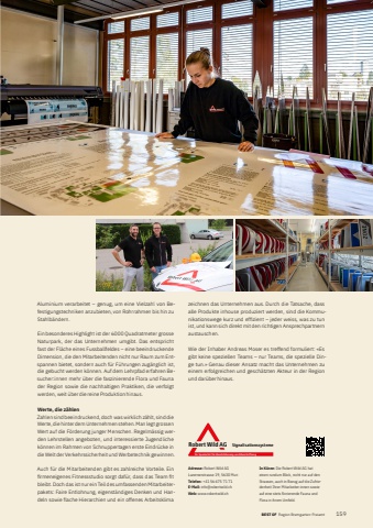 BEST OF Region Bremgarten-Freiamt BEST OF Portrait xxx 15925Robert Wild AG SignalisationssystemeIhr Spezialist f%u00fcr Beschilderung und BeschriftungAdresse: Robert Wild AGLuzernerstrasse 19, 5630 MuriTelefon: +41 56 675 71 71 E-Mail: info@robertwild.chWeb: www.robertwild.chIn K%u00fcrze: Die Robert Wild AG hat einen rundum Blick, nicht nur auf den Strassen, auch in Bezug auf die Zufriedenheit Ihrer Mitarbeiter:innen sowie auf eine stets florierende Fauna und Flora in ihrem Umfeld. Aluminium verarbeitet %u2013 genug, um eine Vielzahl von Befestigungstechniken anzubieten, von Rohrrahmen bis hin zu Stahlb%u00e4ndern.Ein besonderes Highlight ist der 6000 Quadratmeter grosseNaturpark, der das Unternehmen umgibt. Das entspricht fast der Fl%u00e4che eines Fussballfeldes %u2013 eine beeindruck ende Dimension, die den Mitarbeitenden nicht nur Raum zum Entspannen bietet, sondern auch f%u00fcr F%u00fchrungen zug%u00e4nglich ist, die gebucht werden k%u00f6nnen. Auf dem Lehrpfad erfahren Besucher:innen mehr %u00fcber die faszinierende Flora und Fauna der Region sowie die nachhaltigen Praktiken, die verfolgt werden, weit %u00fcber die reine Produktion hinaus.Werte, die z%u00e4hlenZahlen sind beeindruckend, doch was wirklich z%u00e4hlt, sind die Werte, die hinter dem Unternehmen stehen. Man legt grossen Wert auf die F%u00f6rderung junger Menschen. Regelm%u00e4ssig werden Lehrstellen angeboten, und interessierte Jugendliche k%u00f6nnen im Rahmen von Schnuppertagen erste Eindr%u00fccke in die Welt der Verkehrssicherheit und Werbetechnik gewinnen.Auch f%u00fcr die Mitarbeitenden gibt es zahlreiche Vorteile. Ein fi rmeneigenes Fitnessstudio sorgt daf%u00fcr, dass das Team fi t bleibt. Doch das ist nur ein Teil des umfassenden Mitarbeiterpakets: Faire Entlohnung, eigenst%u00e4ndiges Denken und Handeln sowie flache Hierarchien und ein offenes Arbeitsklima zeichnen das Unternehmen aus. Durch die Tatsache, dass alle Produkte inhouse produziert werden, sind die Kommunikationswege kurz und effi zient %u2013 jeder weiss, was zu tun ist, und kann sich direkt mit den richtigen Ansprechpartnern austauschen.Wie der Inhaber Andreas Moser es treffend formuliert: %u00abEs gibt keine speziellen Teams %u2013 nur Teams, die spezielle Dinge tun.%u00bb Genau dieser Ansatz macht das Unternehmen zu einem erfolgreichen und gesch%u00e4tzten Akteur in der Region und dar%u00fcber hinaus.