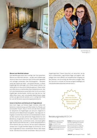 BEST OF Region Bremgarten-Freiamt BEST OF Portrait xxx 16324R%u00e4ume zum Abschied nehmenDas Bestattungsinstitut Koch verf%u00fcgt %u00fcber die passenden R%u00e4ume zum Abschied nehmen %u2013 es gibt zwei Aufbahrungsr%u00e4ume im Haus. Auch diese sind hell und freundlich gestaltet und verf%u00fcgen ausserdem %u00fcber R%u00fcckzugsorte %u2013 beispielsweise den Garten der Stille %u2013 und andere Nischen, in denen Angeh%u00f6rige Zeit verbringen und in Ruhe trauern k%u00f6nnen. Daneben gibt es im Haus einen Abdankungsraum. Dieser bietet eine Alternative zu traditionellen Abschiedszeremonien. Wer sich also beispielsweise ausserhalb einer Kirche von einem Angeh%u00f6rigen verabschieden m%u00f6chte, kann das hier tun. Der offene Raum kann nach individuellen Bed%u00fcrfnissen eingerichtet und geschm%u00fcckt werden und er verf%u00fcgt %u00fcber Platz f%u00fcr rund 50 Personen sowie eine angrenzende K%u00fcche.Urnen in Herzform und Schmuck mit FingerabdruckKarin Koch Sager und Simone Sager m%u00f6chten neben der fachlichen Unterst%u00fctzung auch Platz bieten f%u00fcr Rituale und individuelles Trauern. Darum nimmt sich das Team viel Zeit f%u00fcr Gespr%u00e4che mit Angeh%u00f6rigen und versucht, m%u00f6glichst individuell auf ihre Bed%u00fcrfnisse einzugehen. Das zeigt sich im Angebot. In einem Raum k%u00f6nnen sich Hinterbliebene in Ruhe ein Bild machen von den zahlreichen M%u00f6glichkeiten f%u00fcr eine Bestattung. Ausgestellt sind hier unter anderem klassische Urnen, Wasserurnen, winterharte Urnen, individuell gefertigte St%u00fccke sowie Kleinsturnen, in denen beispielsweise in einem kleinen Herz aus Holz ein Teil der Asche aufbewahrt werden kann. Es gibt bemalte S%u00e4rge und Schmuck, mit einem Fingerabdruck einer verstorbenen Person oder etwas Asche. %u00abDie W%u00fcnsche sind sehr verschieden. Was auch immer Angeh%u00f6rige beim Trauern brauchen, wir versuchen, sie dabei zu unterst%u00fctzen%u00bb, sagt Simone Sager und erg%u00e4nzt: %u00abWir pflegen hier einen offenen und empathischen Umgang mit dem Sterben. Uns ist wichtig, den Menschen zu zeigen, dass der Tod nicht nur schwer ist und man auf ganz vielf%u00e4ltige und individuelle Weise Abschied nehmen kann.%u00bbAdresse: Bestattungsinstitut KOCHRummelstrasse 1, 5610 WohlenTelefon: +41 56 622 13 60E-Mail: koch@bestattungsinstitut-koch.chWeb: www.bestattungsinstitut-koch.chInstagram: bestattungsinstitutkochIn K%u00fcrze: Das Bestattungsinstitut Koch unterst%u00fctzt Angeh%u00f6rige und Trauernde auf empathische und kompetente Weise. Das Unternehmen verf%u00fcgt %u00fcber helle, freundliche R%u00e4ume sowie %u00fcber viel Erfahrung im Umgang mit Trauer und Ritualen.Karin Koch Sager und Simone Sager (v. l.)Wir zeigen, dass man auf vielf%u00e4ltige und individuelle Weise Abschied nehmen kann.Bestattungsinstitut K O C H
