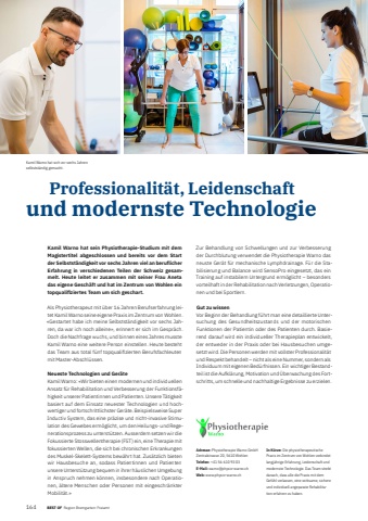 164 20 BEST OF BEST OF Portrait xxx Region Bremgarten-Freiamt Professionalit%u00e4t, Leidenschaft und modernste Technologie Adresse: Physiotherapie Warno GmbHZentralstrasse 20, 5610 WohlenTelefon: +41 56 610 93 03E-Mail: warno@physio-warno.chWeb: www.physio-warno.ch In K%u00fcrze: Die physiotherapeutische Praxis im Zentrum von Wohlen verbindet langj%u00e4hrige Erfahrung, Leidenschaft und modernste Technologie. Das Team strebt danach, dass alle die Praxis mit dem Gef%u00fchl verlassen, eine wirksame, sichere und individuell angepasste Rehabilitation erfahren zu haben.Kamil Warno hat sein Physiotherapie-Studium mit dem Magistertitel abgeschlossen und bereits vor dem Start der Selbstst%u00e4ndigkeit vor sechs Jahren viel an beruflicher Erfahrung in verschiedenen Teilen der Schweiz gesammelt. Heute leitet er zusammen mit seiner Frau Aneta das eigene Gesch%u00e4ft und hat im Zentrum von Wohlen ein topqualifi ziertes Team um sich geschart. Als Physiotherapeut mit %u00fcber 16 Jahren Berufserfahrung leitet Kamil Warno seine eigene Praxis im Zentrum von Wohlen. %u00abGestartet habe ich meine Selbstst%u00e4ndigkeit vor sechs Jahren, da war ich noch alleine%u00bb, erinnert er sich im Gespr%u00e4ch. Doch die Nachfrage wuchs, und binnen eines Jahres musste Kamil Warno eine weitere Person einstellen. Heute besteht das Team aus total f%u00fcnf topqualifi zierten Berufsfachleuten mit Master-Abschl%u00fcssen.Neueste Technologien und Ger%u00e4teKamil Warno: %u00abWir bieten einen modernen und individuellen Ansatz f%u00fcr Rehabilitation und Verbesserung der Funktionsf%u00e4higkeit unserer Patientinnen und Patienten. Unsere T%u00e4tigkeit basiert auf dem Einsatz neuester Technologien und hochwertiger und fortschrittlichster Ger%u00e4te. Beispielsweise Super Inductiv System, das eine pr%u00e4zise und nicht-invasive Stimulation des Gewebes erm%u00f6glicht, um den Heilungs- und Regenerationsprozess zu unterst%u00fctzen. Ausserdem setzen wir die Fokussierte Stosswellentherapie (FST) ein, eine Therapie mit fokussierten Wellen, die sich bei chronischen Erkrankungen des Muskel-Skelett-Systems bew%u00e4hrt hat. Zus%u00e4tzlich bieten wir Hausbesuche an, sodass Patientinnen und Patienten unsere Unterst%u00fctzung bequem in ihrer h%u00e4uslichen Umgebung in Anspruch nehmen k%u00f6nnen, insbesondere nach Operationen, %u00e4ltere Menschen oder Personen mit eingeschr%u00e4nkter Mobilit%u00e4t.%u00bbZur Behandlung von Schwellungen und zur Verbesserung der Durchblutung verwendet die Physiotherapie Warno das neuste Ger%u00e4t f%u00fcr mechanische Lymphdrainage. F%u00fcr die Stabilisierung und Balance wird SensoPro eingesetzt, das ein Training auf instabilem Untergrund erm%u00f6glicht %u2013 besonders vorteilhaft in der Rehabilitation nach Verletzungen, Operationen und bei Sportlern.Gut zu wissenVor Beginn der Behandlung f%u00fchrt man eine detaillierte Untersuchung des Gesundheitszustands und der motorischen Funktionen der Patientin oder des Patienten durch. Basierend darauf wird ein individueller Therapieplan entwickelt, der entweder in der Praxis oder bei Hausbesuchen umgesetzt wird. Die Personen werden mit vollster Professionalit%u00e4t und Respekt behandelt %u2013 nicht als eine Nummer, sondern als Individuum mit eigenen Bed%u00fcrfnissen. Ein wichtiger Bestandteil ist die Aufkl%u00e4rung, Motivation und %u00dcberwachung des Fortschritts, um schnelle und nachhaltige Ergebnisse zu erzielen.Kamil Warno hat sich vor sechs Jahren selbstst%u00e4ndig gemacht.