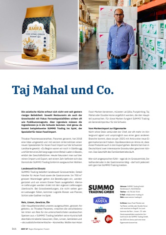 1665 BEST OF BEST OF Portrait xxx Region Bremgarten-FreiamtTaj Mahal und Co. Die asiatische K%u00fcche erfreut sich nicht erst seit gestern riesiger Beliebtheit. Sowohl Restaurants als auch der Grosshandel mit Fokus Fernostspezialit%u00e4ten wirken oft wie Publikumsmagnete. Aber irgendwie m%u00fcssen die Ingredienzen ja in die Schweiz kommen. Und genau da kommt beispielsweise SUMMO Trading ins Spiel, der Spezialist f%u00fcr Asian Food Import.Thivakar Parameswaranathan, Parames genannt, hat 2018 eine Idee umgesetzt und mit seinem Unternehmen einen neuen Spezialisten f%u00fcr Asian Food Import auf die Schweizer Landkarte gesetzt. %u00abZu Beginn waren wir noch in Glattbrugg und f%u00fchrten eine Zeit lang sogar einen Retail-Laden in Basel%u00bb, erkl%u00e4rt der Gesch%u00e4ftsf%u00fchrer. Heute fokussiert man auf den reinen Import und Export, seit einem Jahr befi ndet sich das Domizil der SUMMO Trading GmbH im aargauischen Wohlen.Landesweit im EinsatzSUMMO Trading beliefert landesweit Grossverteiler, Detailh%u00e4ndler f%u00fcr Asian Food sowie die Gastronomie. Im 700 m2grossen Warenlager gehen die Bestellungen ein, werden ger%u00fcstet und von einem Dreier-Team ausgeliefert. Kleinere Lieferungen werden direkt mit den eigenen Lieferwagen %u00fcberbracht. Bei Grossbestellungen, die nicht selten ganze Lastwagen f%u00fcllen, kommen Logistik-Riesen wie Planzer, Sch%u00f6ni oder Galliker ins Spiel. Reis, Linsen, Gew%u00fcrze, %u00d6le%u00abDer Hauptbestandteil unseres ausgesuchten, grossen Angebots%u00bb, so Thivakar Parames, %u00abmachen die verschiedensten Arten von Reis f%u00fcr die unterschiedlichsten asiatiaschen Speisen aus.%u00bb SUMMO Trading beliefert seine Kundschaft ebenfalls mit allerlei Gew%u00fcrzen, %u00d6len, Linsen, Getr%u00e4nken und %u2013 als zus%u00e4tzliche kleine Nische %u2013 Kosmetika. Wollte man Asian Food-Marken benennen, m%u00fcssten Lal Qilla, Punjab King, Taj Mahal oder Double Horse angef%u00fchrt werden, die den Hauptteil ausmachen. F%u00fcr diese Marken fungiert SUMMO Trading als Generalimporteur f%u00fcr die Schweiz.Vom Markenimport zur EigenmarkeNicht ohne Stolz verk%u00fcndet der Chef, der oft mehr im Hintergrund agiert und urspr%u00fcnglich aus einer ganz anderen Branche kommt, dass sie per 2025 mit Amira eine neue Eigenmarke lanciert haben. Das Besondere an Amira ist, dass diese Produkte auch in den Export gehen. Bereits hat man in Deutschland zwei interessante Grosskunden gewinnen k%u00f6nnen. Das Gesch%u00e4ft des Familienbetriebs l%u00e4uft.Wer sich angesprochen f%u00fchlt %u2013 egal ob im Grossvertrieb, Detailhandel oder in der Gastronomie t%u00e4tig %u2013 darf sich jederzeit sehr gern bei SUMMO Trading melden.Adresse: SUMMO Trading GmbHNordstrasse 5, 5610 WohlenTelefon: +41 78 244 70 45E-Mail: info@summo-trading.chWeb: www.summo-trading.chIn K%u00fcrze: Asian Food-Marken wie Taj Mahal, Lal Qilla oder Double Horse sind manchen ein Begriff. Ins Land kommen die Reis-, Linsen-, %u00d6l- oder Gew%u00fcrzspezialit%u00e4ten asiatischer Herkunft durch die SUMMO Trading GmbH, die 2025 mit Amira auch eine neue Eigenmarke lanciert hat.