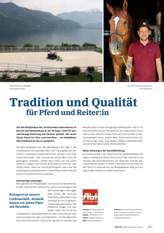 BEST OF Region Bremgarten-Freiamt BEST OF Portrait xxx 1671Tradition und Qualit%u00e4t f%u00fcr Pferd und Reiter:inDie Abt Reitplatzbau AG, ein f%u00fchrendes Unternehmen im Bereich des Reitplatzbaus in der Schweiz, steht f%u00fcr jahrzehntelange Erfahrung und h%u00f6chste Qualit%u00e4t. Mit einem klaren Fokus auf alles rund ums Ross %u2013 von Reitpl%u00e4tzen %u00fcber Paddocks bis hin zu Ausl%u00e4ufen.Die Kernkompetenz der Abt Reitplatzbau AG liegt in der Schaffung von hochwertigen Reit- und Trainingsfl%u00e4chen, die nicht nur %u00e4sthetisch ansprechend sind, sondern auch funktional %u00fcberzeugen. %u00abWir sind auf den ersten Blick nicht die g%u00fcnstigsten Anbieter%u00bb, erkl%u00e4rt Kevin Mani, der das Unternehmen zu Beginn des Jahres 2024 %u00fcbernommen hat. Und erkl%u00e4rt weiter: %u00abAber wir sind die g%u00fcnstigsten, wenn man die langfristige Qualit%u00e4t betrachtet. Unsere Pl%u00e4tze halten %u00fcber 40 Jahre und funktionieren einwandfrei.%u00bbHochwertige LeistungenAls Spezialist f%u00fcr Reitplatzbau und verwandte Bauarbeiten ist das Unternehmen bekannt f%u00fcr seine Zuverl%u00e4ssigkeit und die hochwertigen Leistungen. Vom Einbau der terra-tex Tretschicht, deren Planie und Unterhalt, bis hin zu weiteren Infrastrukturelementen wie Paddocks, Wegen und Ausl%u00e4ufen bietet die Firma ein umfassendes Leistungsportfolio an. Das Unternehmen setzt auf innovative L%u00f6sungen und Materialien, um den Bed%u00fcrfnissen seiner Kundinnen und Kunden gerecht zu werden. Ein Beispiel daf%u00fcr ist das einzigartige Mattensystem, das in Zusammenarbeit mit der Partnerfi rma Terra Bausystem entwickelt wurde. %u00abUnd f%u00fcr unsere Tretschicht verwenden wir den hochwertigen Sand%u00bb, erkl%u00e4rt Mani. Diese technischen Fortschritte sorgen daf%u00fcr, dass Wasser effi zient abfliessen kann und die Unterhaltsarbeiten minimal bleiben.Neuer Schwung in der Gesch%u00e4ftsleitungEin neues Kapitel in der Geschichte der Abt Reitplatzbau AG begann Anfang des Jahres 2024. Kevin Mani %u00fcbernahm die Position des Gesch%u00e4ftsf%u00fchrers von Ren%u00e9 Abt, welcher das Unternehmen bereits in dritter Generation f%u00fchrte. Mani ist seit 2016 im Unternehmen als Reitplatzbauer t%u00e4tig und verf%u00fcgt so %u00fcber breites und tiefes Fachwissen. Adresse: Abt Reitplatzbau AGGrenzstrasse 2, 5623 BoswilTelefon: +41 56 666 11 23E-Mail: info@abt-reitplatz.chWeb: www.abt-reitplatz.chIn K%u00fcrze: Kevin Mani ist auch privat ein grosser Tierfreund und kann nun seine Leidenschaft mit seinem Wissen im Bauwesen kombinieren.Reitsport ist unsere Leidenschaft, deshalb bauen wir jeden Platz mit Herzblut.Kevin Mani f%u00fchrt das Unternehmen seit Anfang 2024.H%u00f6chste Qualit%u00e4t f%u00fcr Reitpl%u00e4tze in der ganzen Schweiz.