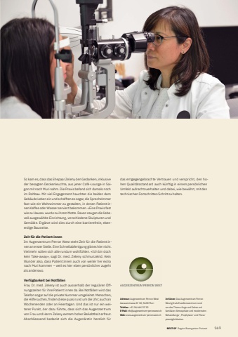 BEST OF Region Bremgarten-Freiamt BEST OF Portrait xxx 1692So kam es, dass das Ehepaar Zeleny den Gedanken, inklusive der besagten Deckenleuchte, aus jener Caf%u00e9-Lounge in Saigon mit nach Muri nahm. Die Praxis befand sich damals noch im Rohbau. Mit viel Engagement hauchten die beiden dem Geb%u00e4ude Leben ein und schafften es sogar, die Sprechzimmer fast wie ein Wohnzimmer zu gestalten, in denen Patient:innen Kaffee oder Wasser serviert bekommen. %u00abEine Praxis fast wie zu Hause%u00bb wurde zu ihrem Motto. Davon zeugen die liebevoll ausgew%u00e4hlte Einrichtung, verschiedene Skulpturen und Gem%u00e4lde. Erg%u00e4nzt wird dies durch eine barrierefreie, ebenerdige Bauweise.Zeit f%u00fcr die Patient:innenIm Augenzentrum Perron West steht Zeit f%u00fcr die Patient:innen an erster Stelle. Eine Schnellabfertigung gibt es hier nicht. Vielmehr sollen sich alle rundum wohlf%u00fchlen. %u00abIch bin doch kein Take-away%u00bb, sagt Dr. med. Zeleny schmunzelnd. Kein Wunder also, dass Patient:innen auch von weiter her extra nach Muri kommen %u2013 weil es hier eben pers%u00f6nlicher zugeht als anderswo.Verf%u00fcgbarkeit bei Notf%u00e4llenFrau Dr. med. Zeleny ist auch ausserhalb der regul%u00e4ren %u00d6ffnungszeiten f%u00fcr ihre Patient:innen da. Bei Notf%u00e4llen wird das Telefon sogar auf die private Nummer umgeleitet. Menschen, die Hilfe suchen, fi nden diese quasi rund um die Uhr; auch an Wochenenden oder an Feiertagen. Und das ist nur ein weiterer Punkt, der dazu f%u00fchrte, dass sich das Augenzentrum von Frau und Herrn Zeleny extrem hoher Beliebtheit erfreut. Abschliessend bedankt sich die Augen%u00e4rztin herzlich f%u00fcr das entgegengebrachte Vertrauen und verspricht, den hohen Qualit%u00e4tsstandard auch k%u00fcnftig in einem pers%u00f6nlichen Umfeld aufrechtzuerhalten und dabei, wie bew%u00e4hrt, mit den technischen Fortschritten Schritt zu halten.Adresse: Augenzentrum Perron WestAarauerstrasse 8%u201310, 5630 MuriTelefon: +41 56 664 92 10E-Mail: info@augenzentrum-perronwest.chWeb: www.augenzentrum-perronwest.chIn K%u00fcrze: Das Augenzentrum Perron West gilt als Exzellenzzentrum rund um das Thema Auge und Sehen mit famili%u00e4rer Atmosph%u00e4re und modernsten Behandlungs-, Prophylaxe- und Therapiem%u00f6glichkeiten.