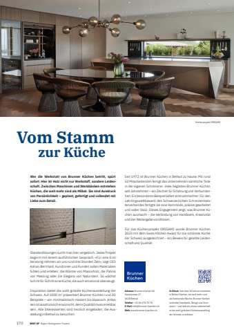 1706 BEST OF BEST OF Portrait xxx Region Bremgarten-FreiamtVom Stamm zur K%u00fccheAdresse: Brunner K%u00fcchen AGHauptsrasse 175618 Bettwil Telefon: +41 56 676 70 70E-Mail: info@brunner-kuechen.ch Web: www.brunner-kuechen.ch In K%u00fcrze: Seit %u00fcber 50 Jahren entstehen in Bettwil K%u00fcchen, die weit mehr sind als funktionale R%u00e4ume. Brunner K%u00fcchen verbindet Handwerk, Design und Innovation %u2013 und l%u00e4dt ein, diese Leidenschaft in der wohl gr%u00f6ssten K%u00fcchenausstellung der Schweiz zu erleben.K%u00fcchenprojekt ORIGAMIWer die Werkstatt von Brunner K%u00fcchen betritt, sp%u00fcrt sofort: Hier ist Holz nicht nur Werkstoff, sondern Leidenschaft. Zwischen Maschinen und Werkb%u00e4nken entstehen K%u00fcchen, die weit mehr sind als M%u00f6bel. Sie sind Ausdruck von Pers%u00f6nlichkeit %u2013 geplant, gefertigt und vollendet mit Liebe zum Detail.Standardl%u00f6sungen sucht man hier vergeblich. Jedes Projekt beginnt mit einem ausf%u00fchrlichen Gespr%u00e4ch. %u00abF%u00fcr eine Erstberatung nehmen wir uns rund drei Stunden Zeit%u00bb, sagt CEO Adrian Bernhard. Kundinnen und Kunden sollen Materialien f%u00fchlen und erleben: die W%u00e4rme von Massivholz, die Patina von Messing oder die Eleganz von Naturstein. So w%u00e4chst Schritt f%u00fcr Schritt eine K%u00fcche, die auch emotional %u00fcberzeugt.Inspiration bietet die wohl gr%u00f6sste K%u00fcchenausstellung der Schweiz. Auf 1000 m%u00b2 pr%u00e4sentiert Brunner K%u00fcchen rund 30 Beispiele %u2013 von minimalistisch-modern bis klassisch. Anfassen ist ausdr%u00fccklich erw%u00fcnscht, denn Qualit%u00e4t muss erlebbar sein. Alle Interessierten sind herzlich eingeladen, die Ausstellung in Bettwil zu besuchen.Seit 1972 ist Brunner K%u00fcchen in Bettwil zu Hause. Mit rund 50 Mitarbeitenden fertigt das Unternehmen s%u00e4mtliche Teile in der eigenen Schreinerei. Viele begleiten Brunner K%u00fcchen seit Jahrzehnten %u2013 ein Zeichen f%u00fcr Erfahrung und Verbundenheit. Ein besonderes Beispiel liefert eine Lehrtochter: F%u00fcr den Lehrlingswettbewerb des Schweizerischen Schreinermeisterverbandes fertigte sie eine Kommode, pr%u00e4zise gearbeitet und voller Stolz. Dieses Engagement zeigt, was Brunner K%u00fcchen ausmacht %u2013 die Verbindung von Handwerk, Kreativit%u00e4t und der Weitergabe von Wissen.F%u00fcr das K%u00fcchenprojekt ORIGAMI wurde Brunner K%u00fcchen 2023 mit dem Swiss Kitchen Award f%u00fcr die sch%u00f6nste K%u00fcche der Schweiz ausgezeichnet %u2013 ein Beweis f%u00fcr gelebte Leidenschaft und Qualit%u00e4t.