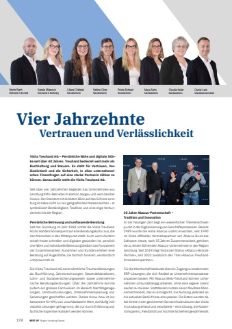 178 BEST OF BEST OF Portrait xxx Region Lenzburg-SeetalVier Jahrzehnte Vertrauen und Verl%u00e4sslichkeitVisita Treuhand AG %u2013 Pers%u00f6nliche N%u00e4he und digitale St%u00e4rke seit %u00fcber 40 Jahren. Treuhand bedeutet weit mehr als Buchhaltung und Steuern. Es steht f%u00fcr Vertrauen, Verl%u00e4sslichkeit und die Sicherheit, in allen unternehmerischen Finanzfragen auf eine starke Partnerin z%u00e4hlen zu k%u00f6nnen. Genau daf%u00fcr steht die Visita Treuhand AG. Seit %u00fcber vier Jahrzehnten begleitet das Unternehmen aus Lenzburg KMU-Betriebe im Kanton Aargau und weit dar%u00fcber hinaus. Der Standort mit direktem Blick auf das Schloss Lenzburg ist dabei nicht nur ein geografi sches Markenzeichen %u2013 er symbolisiert Best%u00e4ndigkeit, Tradition und eine enge Verbundenheit mit der Region.Pers%u00f6nliche Betreuung und umfassende BeratungSeit der Gr%u00fcndung im Jahr 1984 richtet die Visita Treuhand AG ihr Handeln konsequent auf eine Beratungskultur aus, die den Menschen in den Mittelpunkt stellt. Auch wenn die Wirtschaft heute schneller und digitaler geworden ist, pers%u00f6nliche N%u00e4he und individuelle Betreuung bleiben das Fundament der Zusammenarbeit. Kundinnen und Kunden erleben eine Beratung auf Augenh%u00f6he, die fachlich fundiert, verst%u00e4ndlich und praxisnah ist.Die Visita Treuhand AG deckt s%u00e4mtliche Treuhandleistungen ab: Buchf%u00fchrung, Jahresrechnungen, Steuerdeklarationen, Lohn- und Sozialversicherungswesen sowie unternehmerische Beratungsleistungen. %u00dcber die Jahrzehnte konnte zudem ein grosses Fachwissen im Bereich Nachfolgeregelungen, Umstrukturierungen, Unternehmensplanung und Sanierungen geschaffen werden. Dieses Know-how ist insbesondere f%u00fcr KMU von unsch%u00e4tzbarem Wert, da h%u00e4ufi g individuelle L%u00f6sungen gefragt sind, die nur durch Erfahrung und fachliche Expertise realisiert werden k%u00f6nnen.35 Jahre Abacus-Partnerschaft %u2013 Tradition und InnovationIn der heutigen Zeit liegt ein wesentlicher Themenschwerpunkt in der Digitalisierung von Gesch%u00e4ftsprozessen. Bereits 1989 wurde die erste Abacus-Lizenz erworben, seit 1990 ist Visita offi zieller Vertriebspartner von Abacus Business Software. Heute, nach 35 Jahren Zusammenarbeit, geh%u00f6ren sie zu einem f%u00fchrenden Abacus-Unternehmen in der Region Lenzburg. Seit 2019 tr%u00e4gt Visita den Status %u00abAbacus-BronzePartner%u00bb, seit 2022 zus%u00e4tzlich den Titel %u00abAbacus-TreuhandInnovationspartner%u00bb.F%u00fcr die Klientschaft bedeutet dies ein Zugang zu modernsten ERP-L%u00f6sungen, die sich flexibel an Unternehmensprozesse anpassen lassen. Mit Abacus Web-Treuhand k%u00f6nnen Unternehmen ortsunabh%u00e4ngig arbeiten, ohne eine eigene Lizenz kaufen zu m%u00fcssen. Stattdessen nutzen sie ein flexibles Abonnementmodell, das es erm%u00f6glicht, die Nutzung jederzeit an die aktuellen Bed%u00fcrfnisse anzupassen. Die Daten werden dabei direkt in den gesicherten Serverinfrastrukturen der Visita in Lenzburg erfasst und verarbeitet %u2013 eine L%u00f6sung, die Kostentransparenz, Flexibilit%u00e4t und h%u00f6chste Sicherheit gew%u00e4hrleistet.