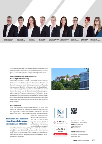 BEST OF Region Lenzburg-Seetal BEST OF Portrait xxx 1792Adresse: Visita Treuhand AGNiederlenzerstr. 25, 5600 LenzburgTelefon: +41 62 886 91 00E-Mail: info@visita.chWeb: www.visita.chIn K%u00fcrze: Die Visita ist als dienstleistungsorientiertes, innovatives und modernes Treuhandunternehmen f%u00fcr die Zukunft bereit.Unsere erfahrenen Key User agieren als kompetente Schnittstelle zwischen Fachbereich und Systemtechnologie und sorgen f%u00fcr einen reibungslosen und praxisbezogenen Support.GeB%u00fcV-Zertifi zierung 2024 %u2013 Know-how f%u00fcr die digitale ArchivierungIm Oktober 2024 hat die Visita Treuhand AG einen weiteren Meilenstein erreicht: Als erstes Treuhandunternehmen in der Schweiz wurde sie durch die Kompetenzzentrum Records Management AG (KRM) erfolgreich nach der Gesch%u00e4ftsb%u00fccherverordnung (GeB%u00fcV) auditiert und zertifi ziert. Damit konnte das Know-how f%u00fcr die elektronische Gestaltung der administrativen Prozesse, respektive vom Papierbeleg bis zur gesetzeskonformen Archivierung, geschaffen werden. Die Visita Treuhand AG kann ihre Mandanten kompetent beim Analysieren der Gesch%u00e4ftsprozesse und bei deren Digitalisierung unterst%u00fctzen.Blick nach vorne%u00dcber 40 Jahre treuh%u00e4nderische Erfahrung, 35 Jahre Partnerschaft mit Abacus, die GeB%u00fcV-Zertifi zierung 2024 und die enge Verbundenheit mit den KMU-Betrieben in der der Region: Die Visita Treuhand AG verbindet die traditionellen Werte mit Innovation und Modernit%u00e4t. Das Unternehmen ist ein verl%u00e4sslicher Begleiter f%u00fcr alle, die Wert auf fachliche Kompetenz, pers%u00f6nliche Betreuung und zukunftsorientierte L%u00f6sungen legen. Auch in den kommenden Jahren wird die Visita Treuhand AG den Unternehmen und Partnerfi rmen auf Augenh%u00f6he begegnen und sie bei der Wahrnehmung ihrer unternehmerischen Aufgaben unterst%u00fctzen und begleiten. Treuhand mit pers%u00f6nlichen Dienst leistungen und digitaler Effi zienzTreuhand