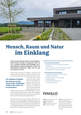 180 26 BEST OF BEST OF Portrait xxx Region Lenzburg-SeetalMensch, Raum und Natur im Einklang %u00abIch baue und transformiere R%u00e4ume mit Ernstkaftigkeit.%u00bb Alessio Feniello, Architekt aus Rupperswil, kennt sich aus. Er verbindet Kreativit%u00e4t und Nachhaltigkeit und erzeugt Treffpunkte zwischen %u00f6kologischen, sozialen und wirtschaftlichen Bed%u00fcrfnissen. Klingt nicht nur spannend, sondern ist es auch.Mensch, Raum und Natur in Einklang %u2013 individuell, hochwertig und pers%u00f6nlich betreut. Alessio Fenielllo sieht sich als Traumhaus-Architekt und erz%u00e4hlt gleich selber, worauf es ihm ankommt und was Kund:innen wissen sollten: %u00abWir sind ein kleines, eingespieltes Team aus zwei Personen: Vito Forgione ist Bauleiter und ich bin Architekt und Gesch%u00e4ftsinhaber. Jedes Projekt wird von uns beiden pers%u00f6nlich betreut. Unsere St%u00e4rke liegt in der individuellen Umsetzung: Wir h%u00f6ren zu, nehmen W%u00fcnsche gezielt auf und entwickeln gemeinsam mit unsere Kundschaft Architektur, die auf ihre Lebensweise zugeschnitten ist.%u00bbDer Schwerpunkt von Feniello Architektur & Bau AG ist der Wohnbau %u2013 vom hochwertigen Einfamilienhaus bis zu anspruchsvollen Mehrfamilienh%u00e4usern und Wohnanlagen. Dabei legt das versierte und eingespielte Duo besonderen Wert auf langlebige, %u00e4sthetische und funktionale L%u00f6sungen, die Mensch, Raum und Natur harmonisch verbinden.Adresse: Feniello Architektur & Bau AGSandweg 5, 5102 RupperswilTelefon: +41 76 464 05 48E-Mail: feniello@feniello-architektur.chWeb: www.feniello-architektur.chIn K%u00fcrze: Feniello Architektur & Bau AG steht f%u00fcr hochwertige Architektur %u2013 massgeschneidert, nachhaltig geplant und umgesetzt. Das garantieren der Architekt Alessio Feniello und der Bauleiter Vito Forgione. Daf%u00fcr brennen sie. Leidenschaft, K%u00f6pfchen und Know-how im Einklang.F%u00fcr private Bauherrschaften:%u2022 Massgeschneiderte Planung nach individuellen Bed%u00fcrfnissen%u2022 Hohe architektonische und handwerkliche Qualit%u00e4t%u2022 Nachhaltige und funktionale L%u00f6sungenF%u00fcr Investorinnen und Investoren:%u2022 Langj%u00e4hrige, erfolgreiche Zusammenarbeit mit festen Partnerfi rmen%u2022 Verl%u00e4sslicher Partner f%u00fcr hochwertige Wohnbauprojekte%u2022 Ziel: Neue Investoren gewinnen und langfristig betreuenIch realisiere Projekte, die nicht nur in das Leben vieler eindringen, sondern das Leben vieler bereichert.