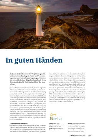 BEST OF Region Lenzburg-Seetal BEST OF Portrait xxx 1831In guten H%u00e4ndenAdresse: Baviso GmbHEichhofstrasse 1, 5604 HendschikenTelefon: +41 56 555 84 36E-Mail: carla.dioum@baviso.chWeb: www.baviso.chIn K%u00fcrze: Die Baviso GmbH ist spezialisiert auf ERP-Projekte und Unternehmensberatung f%u00fcr KMUs. Gesch%u00e4ftsf%u00fchrerin Carla Dioum ist eine ehrliche und kooperative Zusammenarbeit mit den Menschen hinter den Firmen wichtig. Die Baviso GmbH %u00fcbernimmt ERP-Projektleitungen, bietet Unternehmensberatung mit Projekt- und Personalmanagement sowie Controlling und Reporting und k%u00fcmmert sich um treuh%u00e4nderische T%u00e4tigkeiten. Das alles mit einem tiefen Verst%u00e4ndnis f%u00fcr die Menschen hinter den Unternehmen.Sie sei schon immer ein Zahlenmensch gewesen, sagt Carla Dioum und erz%u00e4hlt weiter, dass sie ihre Liebe f%u00fcr alles Numerische von ihren Eltern geerbt habe, die im Finanzbereich t%u00e4tig waren. Nach ihrer KV-Ausbildung, diversen Weiterbildungen bis hin zur Diplomierten Betriebswirtschafterin NDS HF und nach F%u00fchrungspositionen als oberste Finanzverantwortliche CFO bei verschiedenen Unternehmen erstaunt es nicht, dass sie mit einer Freundin bald ihre eigene Firma gr%u00fcndete: die Baviso GmbH. %u00abWir haben durch Erfahrung festgestellt, dass gerade KMUs bei ERP-Prozessen oft %u00fcberfordert sind, weil sie %u00fcber keine spezialisierte Projekt- oder IT-Abteilung verf%u00fcgen%u00bb, sagt Carla Dioum, die das Unternehmen mittlerweile allein f%u00fchrt. ERP %u2013 also %u00abEnterprise Resource Planning%u00bb %u2013 ist die digitale Abbildung und Integration aller zentralen Gesch%u00e4ftsprozesse eines Unternehmens in einem einzigen Softwaresystem, um Ressourcen effi zient zu planen, zu steuern und zu kontrollieren.Zusammenarbeit elementar%u00abOb die Baviso GmbH mitten in einem ERP-Projekt von einem KMU dazugeholt wird, weil es feststeckt, oder ob wir von Anfang an bei Planung und Umsetzung involviert sind: Ziel ist es, dass die Kund:innen verstehen, worum es bei den Systemen tats%u00e4chlich geht und dass sie am Ende selbstst%u00e4ndig damit umgehen k%u00f6nnen.%u00bb Es sei ihr wichtig, nahe bei den Menschen zu sein, zu sp%u00fcren, was das Unternehmen wirklich ben%u00f6tige. %u00abDie Probleme bei den Firmen liegen nicht immer dort, wo die Gesch%u00e4ftsleitung sie vermuten. Meine St%u00e4rke ist es, genau zuzuh%u00f6ren und sehr schnell ein Gesp%u00fcr daf%u00fcr zu kriegen, wo der Schuh wirklich dr%u00fcckt%u00bb. Falls gew%u00fcnscht, durchleuchte sie auch die ganze Firma, %u00fcbernehme ad interim Finanz- und Rechnungswesen oder berate rund ums Thema Personalmanagement, so Carla Dioum. Mit ihrer Unterst%u00fctzung bei ERP-Prozessen k%u00f6nne sie oft Mitarbeitende entlasten und Burn-Outs verhindern. Carla Dioums Expertise beruht auf jahrelanger Erfahrung. Sie weiss, was es braucht, um erfolgreich zusammenzuarbeiten: gegenseitiges Vertrauen und eine direkte und offene Kommunikation.