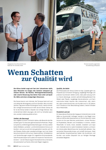 186 BEST OF BEST OF Portrait xxx Region Lenzburg-SeetalWenn Schatten zur Qualit%u00e4t wirdDie Klinso GmbH sorgt seit fast drei Jahrzehnten daf%u00fcr, dass Menschen im Aargau den Sommer entspannt geniessen k%u00f6nnen. Ob Markise, Wintergartenbeschattung oder smarte Steuerung: Das kleine Team setzt auf Qualit%u00e4t, N%u00e4he und einen einzigartigen Showroom.Die Sonne brennt vom Himmel, die Terrasse heizt sich auf, und selbst der Wintergarten wird zum Glutofen. Wer an einem solchen Tag einen k%u00fchlen R%u00fcckzugsort sucht, merkt schnell: Der richtige Sonnenschutz ist mehr als ein Detail. Genau daf%u00fcr ist die Klinso GmbH in Staufen die richtige Adresse. Das Unternehmen liefert L%u00f6sungen, die nicht nur Schatten spenden, sondern Lebensqualit%u00e4t sichern.Vielfalt, die %u00fcberzeugtDas Angebot ist breit und deckt nahezu alle Bereiche der Beschattung ab. F%u00fcr draussen gibt es klassische Markisen, Pergola-Systeme und Wintergartenbeschattungen. Am Haus selbst bieten Rolll%u00e4den, Lamellen- und Sicherheitsstoren Schutz und Komfort. Und wer es sich drinnen gem%u00fctlich machen will, fi ndet Plissees, Rollos oder Lamellenvorh%u00e4nge. Auch der Insektenschutz kommt nicht zu kurz: Spannrahmen, Schiebet%u00fcren und Sonderl%u00f6sungen sorgen f%u00fcr ungest%u00f6rte Sommerabende. Viele Produkte lassen sich zudem mit moderner Technik kombinieren %u2013 von der Steuerung per Smartphone bis zu Sensoren, die automatisch auf Sonne, Wind oder Regen reagieren.Qualit%u00e4t, die bleibtDie Philosophie der Klinso GmbH ist klar: Qualit%u00e4t geht vor. Produkte aus Schweizer Fertigung, sorgf%u00e4ltige Montage und pr%u00e4zises Ausmessen stellen sicher, dass jede L%u00f6sung nicht nur heute %u00fcberzeugt, sondern jahrzehntelang Bestand hat. Metall statt Plastik, langlebige Konstruktionen und fachm%u00e4nnische Arbeit machen den Unterschied. %u00abWir m%u00f6chten, dass unsere Kundinnen und Kunden auch in 20 Jahren noch Freude an ihrer Beschattung haben%u00bb, betont Inhaber Kevin Meierhofer.Pers%u00f6nlich und nahEin besonderes Merkmal der Aargauer Unternehmens ist die N%u00e4he zur Kundschaft. Anfragen werden in der Regel innerhalb von 48 Stunden beantwortet, ein Termin l%u00e4sst sich meist binnen ein bis zwei Wochen vereinbaren. %u00abUnser Monteur ist Projektleiter, Berater und Installateur in einem%u00bb, erkl%u00e4rt Meierhofer. Er ber%u00e4t, misst, bestellt, installiert und repariert. Deshalb kennt er jede Installation bestens und kann die individuellen Bed%u00fcrfnisse der Kundschaft abholen. Das vermeidet Missverst%u00e4ndnisse und schafft Vertrauen. Statt wechselnder Ansprechpartner haben die Kundinnen und Kunden vom ersten Gespr%u00e4ch bis zur fertigen Montage denselben Begleiter.%u00dcbergabe der Firma Klinso GmbH in die H%u00e4nde der H.M. Storenbau GmbHMit einem komplett ausger%u00fcsteten Servicefahrzeug auf Reparatur