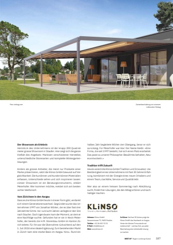 BEST OF Region Lenzburg-Seetal BEST OF Portrait xxx 1872Adresse: Klinso GmbHAarauerstrasse 72, 5603 StaufenTelefon: +41 56 441 51 51E-Mail: info@klinso.chWeb: www.klinso.chIn K%u00fcrze: Seit fast 30 Jahren pr%u00e4gt die Klinso GmbH das Handwerk im Aargau. Hinter der kleinen Firma steckt viel Leidenschaft %u2013 und das Ziel, aus jeder Beschattung eine individuelle L%u00f6sung zu machen.Der Showroom als ErlebnisHerzst%u00fcck des Unternehmens ist der knapp 200 Quadratmeter grosse Showroom in Staufen. Hier zeigt sich die ganze Vielfalt des Angebots: Markisen verschiedener Hersteller, unterschiedliche Storenarten und komplette Wintergartenl%u00f6sungen.Anders als grosse Anbieter, die meist nur Produkte einer Marke pr%u00e4sentieren, setzt die Klinso GmbH bewusst auf Vergleichbarkeit. Die Kundinnen und Kunden k%u00f6nnen Materialien anfassen, Unterschiede sehen und sich inspirieren lassen. %u00abUnser Showroom ist ein Beratungsinstrument%u00bb, erkl%u00e4rt Meierhofer. Wer kommen m%u00f6chte, meldet sich am besten vorher telefonisch.Vom Z%u00fcrichsee in den AargauDass es die Klinso GmbH heute in dieser Form gibt, verdankt sich einem Generationenwechsel. Gegr%u00fcndet wurde das Unternehmen 1997 von Jonathan W%u00f6rlen, der es %u00fcber fast drei Jahrzehnte f%u00fchrte. Vor rund acht Jahren verlegte er den Sitz nach Staufen. Doch irgendwann kam der Moment, an dem er eine Nachfolge suchte. Gefunden hat er sie in Kevin Meierhofer, der bereits die H.M. Storenbau GmbH im Kanton Z%u00fcrich leitete. F%u00fcr ihn war die %u00dcbernahme r%u00fcckwirkend auf den 1.%u00a0Juli 2024 eine ideale Erg%u00e4nzung: Zum bestehenden Markt in Z%u00fcrich kam eine starke Basis im Aargau hinzu. Rund ein halbes Jahr begleitete W%u00f6rlen den %u00dcbergang, bevor er sich zur%u00fcckzog. F%u00fcr Meierhofer war klar: Der Name bleibt. %u00abEine Firma, die seit 1997 besteht, hat sich einen Platz erarbeitet. Das passt zu unserer Philosophie: Bew%u00e4hrtes behalten, Neues entwickeln.%u00bbTradition trifft ZukunftHeute vereint die Klinso GmbH Tradition und Innovation: die Best%u00e4ndigkeit eines Unternehmens mit fast 30 Jahren Erfahrung, kombiniert mit der Energie eines neuen Inhabers und einem Team, das N%u00e4he, Service und Qualit%u00e4t lebt.Wer also an einem heissen Sommertag nach Abk%u00fchlung sucht, fi ndet hier L%u00f6sungen, die den Alltag sch%u00f6ner und nachhaltiger machen.Foto: stobag.com Gartenbeschattung von unserem Lieferanten Stobag