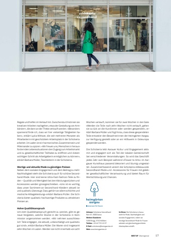 BEST OF BEST OF %u00dcberregional 171Adresse: Schickeria SecondhandRain 47, 5000 AarauWeitere Standorte: 5200 Brugg, 5742 K%u00f6llikenTelefon: +41 62 723 41 57E-Mail: schickeria@heimgaerten.chWeb: www.heimgaerten.chIn K%u00fcrze: Die Schickeria in Aarau steht f%u00fcr Mode, Nachhaltigkeit und soziales Engagement, indem sie trendige Secondhand-Mode f%u00fcr Frauen anbietet und gleichzeitig gesch%u00fctzte Arbeitspl%u00e4tze schafft.Regale und helfen im Verkauf mit. Zwischendurch k%u00f6nnen sie kreativen Arbeiten nachgehen, etwa der Gestaltung von Armb%u00e4ndern, die dann an der Theke verkauft werden. %u00abBesonders spannend fi nde ich, dass wir hier vielseitige T%u00e4tigkeiten haben%u00bb, erkl%u00e4rt Lydia Wittwer, die seit mehreren Monaten als Mitarbeiterin mit gesch%u00fctztem Arbeitsplatz in der Schickeria arbeitet. Im Laden ist ein harmonisches Zusammensein und Miteinander zu sp%u00fcren. %u00abWir freuen uns, Menschen in herausfordernden Lebenssituationen den Zugang zum Arbeitsmarkt und zu gesellschaftlicher Teilhabe zu er%u00f6ffnen und diesen wichtigen Schritt als Arbeitgeberin erm%u00f6glichen zu k%u00f6nnen%u00bb, erkl%u00e4rt Barbara M%u00fcller, Teamleiterin in der Schickeria.Wertige und aktuelle Mode zu g%u00fcnstigen PreisenNeben dem sozialen Engagement und dem Beitrag zu mehr Nachhaltigkeit steht die Schickeria auch f%u00fcr sch%u00f6ne Secondhand-Mode. Hier sind keine Ultra-Fast-Fashion-Teile zu fi nden %u2013 Qualit%u00e4t und Wertigkeit bei den Kleidungsst%u00fccken und Accessoires werden grossgeschrieben. %u00abUns ist es wichtig, dass unser Sortiment an Secondhand-Kleidern aktuell ist und qualitativ %u00fcberzeugt. Dazu geh%u00f6rt vor allem schlichte und modische Alltagskleidung%u00bb erkl%u00e4rt Barbara M%u00fcller. Die Schickeria bietet qualitativ hochwertige Produkte zu attraktiven Preisen an.Hoher Qualit%u00e4tsanspruchUm dem Qualit%u00e4tsanspruch gerecht zu werden, gibt es genaue Vorgaben, welche St%u00fccke in der Schickeria in Kommission angenommen werden. %u00abWir nehmen ausschliesslich Teile entgegen, die aktuell, unbesch%u00e4digt und qualitativ gut sind%u00bb, erkl%u00e4rt Barbara M%u00fcller. Die Waren sind insgesamt zehn Wochen im Laden. Werden sie nicht innerhalb von acht Wochen verkauft, kommen sie f%u00fcr zwei Wochen in den Sale. %u00abWerden die Teile nach zehn Wochen nicht verkauft, gehen sie zur%u00fcck an die Kundinnen oder werden gespendet%u00bb, erkl%u00e4rt Barbara M%u00fcller und f%u00fcgt hinzu, dass diese gespendeten Teile entweder den Bewohnerinnen der Heimg%u00e4rten Aargau zur Verf%u00fcgung gestellt oder an ein Hilfswerk in Osteuropa gespendet werden.Die Schickeria lebt Aarauer Kultur und Engagement aktiv mit und engagiert sich als Teil der lokalen Gemeinschaft bei verschiedenen Veranstaltungen. So wird das Gesch%u00e4ft jedes Jahr zum Beispiel w%u00e4hrend %u00abFlower to Arts%u00bb im Aargauer Kunsthaus passend dekoriert und blumig umgestaltet. Zusammenfassend vereint die Schickeria stilbewusste Secondhand-Mode und -Accessoires f%u00fcr Frauen mit gelebter gesellschaftlicher Verantwortung und bietet Raum f%u00fcr Wertsch%u00e4tzung und Chancen. schickeria secondhand