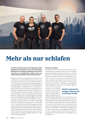 188 BEST OF BEST OF Portrait xxx Region Lenzburg-SeetalMehr als nur schlafenDie Meili Production AG stellt mit der Eigenmarke Fanello Bettsysteme und Matratzen her, die auf die individuellen Bed%u00fcrfnisse der Kundschaft angefertigt werden k%u00f6nnen und nicht nur im Schlafzimmer, sondern auch in verwinkelte Wohnmobil-Ecken und Boots-Kaj%u00fcten passen. Was gibt es Sch%u00f6neres, als jemandem zu einem guten, gesunden Schlaf zu verhelfen? Wahrscheinlich nicht viel. Und so arbeitet Ady Meili mit seinem Team leidenschaftlich daran, f%u00fcr alle Kund:innen die passende Matratze oder gleich das passende Bett herzustellen. %u00abWir sind spezialisiert auf Massanfertigungen, beispielsweise f%u00fcr die Schlafecke in einem Caravan oder auf einem Boot, produzieren aber auch Matratzen und Bettsysteme f%u00fcr zu Hause%u00bb, sagt Ady Meili von der Meili Production AG mit einem Lachen im Gesicht. Seine technische N%u00e4herei stellt zudem beispielsweise Taschen f%u00fcr Alph%u00f6rner, Tragriemen f%u00fcr Trommeln, Regenschutz f%u00fcr Blasinstrumente oder Blachen f%u00fcr die %u00abPostw%u00e4geli%u00bb her. %u00abWir sind sehr offen und setzen uns gerne mit den Anfragen, die bei uns eintreffen, auseinander und suchen L%u00f6sungen.%u00bb Angefangen habe alles mit Rucks%u00e4cken, sagt Ady Meili. Er ist Gesch%u00e4ftsf%u00fchrer in der bereits vierten Generation, gegr%u00fcndet wurde das Unternehmen 1937, damals noch als Meili + Co. AG. Die Neustrukturierungen und die allm%u00e4hliche %u00dcbernahme von Ady Meili und seiner Schwester nach dem zwischenzeitlichen Konkurs 2004 brachte neuen Schwung in die Firma, die seit den Neunzigern vor allem f%u00fcr die eigene Matratzen- und Bettenmarke Fanello bekannt ist. Matratzen neu gedachtDie eigene Marke entstand, nachdem sich H%u00fcsler Nest in Richtung Osten verabschiedet hatte. Die Firma hatte Bettsysteme und Matratzen zuerst bei der Meili + Co. AG anfertigen lassen. %u00abBei der Entwicklung von Fanello war unserer Familie von Anfang an wichtig, der Kundschaft genau zuzuh%u00f6ren und von ihr zu lernen. Nur so schafften wir es, Matratzen und Betten herzustellen, die auch wirklich bei den Leuten ankamen.%u00bb Diesem Konzept folgend %u2013 den Menschen zuzuh%u00f6ren und zu lernen %u2013 ist auch die neuste Matratzenvariante aufgebaut. Diese nennt sich %u00abfanello WellCom Home%u00bb und ist so jung, dass Sie es noch nicht ins Netz geschafft hat. %u00abWir animieren unsere Kundschaft dazu, die H%u00e4rte der Matratze selbst zu w%u00e4hlen und geben daf%u00fcr verschiedene Schaumstoffschichten mit. Diese k%u00f6nnen in die Matratze eingef%u00fcgt oder daraus entfernt werden. Auch die Reihenfolge der Schaumstoffe, die %u00fcbereinander geschichtet zur Matratze werden, spielt dabei eine Rolle%u00bb, erkl%u00e4rt Meili. Ein weiterer Vorteil dieses Systems: Die einzelnen Teile werden nicht verklebt, wie das sonst %u00fcblich ist. So sind die Matratzen nachhaltiger und rezyklierbar. Wiederverwertbar seien n%u00e4mlich bis heute die wenigsten Matratzen, so Ady Meili. Auf Wunsch liefert die Meili Production AG auch St%u00fctzele mente, die als Lattenrost dienen und biegsam sowie einstellbar sind.fanello sorgt mit der richtigen Matratze f%u00fcr erholsamen Schlaf.