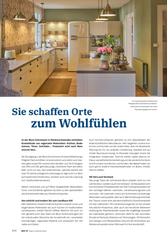 190 BEST OF BEST OF Region Lenzburg und Seetal Region Lenzburg-SeetalSie schaffen Orte zum Wohlf%u00fchlenIn der Blum Schreinerei in Meisterschwanden entstehen Einzelst%u00fccke aus regionalen Materialien: K%u00fcchen, Badezimmer, T%u00fcren, Schr%u00e4nke %u2026 Produziert wird nach Mass und mit Herz.Der Rundgang in der Blum Schreinerei mit Gesch%u00e4ftsleitungsMitglied Patrick Hilfi ker ist eindr%u00fccklich und sofort wird klar: Hier geht etwas! Mit modernsten Ger%u00e4ten und Technologien wie CAD und CNC geht das junge, motivierte Team ans Werk. Aber nicht nur das: Das Unternehmen, welches bereits seit %u00fcber 70 Jahren erfolgreich unterwegs ist, legt nicht nur Wert auf modernste Infrastruktur, sondern auch auf das urspr%u00fcnglich, traditionelle Handwerk. Neben individuell und auf Mass hergestellten Badm%u00f6beln, T%u00fcren und Schr%u00e4nken geh%u00f6ren K%u00fcchen zu den Spezialit%u00e4ten des Schreinerbetriebs aus Meisterschwanden.Von schlicht und modern bis zum Landhaus-Stil%u00abWir realisieren sowohl moderne K%u00fcchen in klaren Linien und zeigem%u00e4ssen Materialien als auch K%u00fcchen im traditionellen Landhausstil%u00bb, erkl%u00e4rt Patrick Hilfi ker. Welcher Stil auch immer gew%u00e4hlt wird: Das Team der Blum Schreinerei geht auf die individuellen W%u00fcnsche der Kundschaft ein, verarbeitet hochwertiges, regionales Material und produziert mit viel Liebe zum Detail.Auch K%u00fcchenumbauten geh%u00f6ren zu den Spezialit%u00e4ten der leidenschaftlichen Berufsleute. %u00abWir begleiten unsere Kundinnen und Kunden von der ersten Idee, %u00fcber die detaillierte Planung bis hin zur pr%u00e4zisen Umsetzung. Aspekte wie optimale Raumausnutzung, funktionale L%u00f6sungen sowie die Integration modernster Technik stehen dabei ebenso im Fokus wie %u00e4sthetische Gestaltung und die pers%u00f6nliche Handschrift unserer Kundinnen und Kunden. Bei Bedarf holen wir auch gerne andere Handwerksbetriebe ins Boot%u00bb, erkl%u00e4rt Patrick Hilfi ker. Mit Herz und VerstandDas junge Team der Schreinerei Blum arbeitet nicht nur mit viel Herzblut, sondern auch mit Verstand. So fokussieren sich die motivierten Mitarbeitenden auf ihre Firmenphilosophie mit den wichtigen Werten %u00abwertvoll%u00bb, %u00abverantwortungsvoll%u00bb und %u00absinnvoll%u00bb. Mit %u00abwertvoll%u00bb meint die Schreinerei hochwertige Materialien und Qualit%u00e4t, aber auch Wertsch%u00e4tzung innerhalb des Teams sowie eine partnerschaftliche Zusammenarbeit mit den Lieferanten. Mit %u00abverantwortungsvoll%u00bb ist die umweltfreundliche Produktion, aber auch die berufliche Weiterentwicklung der Mitarbeitenden sowie die sorgf%u00e4ltige Auswahl der Lieferanten gemeint. %u00abSinnvoll%u00bb steht f%u00fcr den sinnvollen Einsatz an Personal, Material und Technologien. Mit formsch%u00f6nen Designs und Massarbeiten erreicht die Schreinerei aus Meisterschwanden einen Mehrwert f%u00fcr ihre Kundschaft.In Zusammenarbeit mit Steinmann Malergesch%u00e4ft & Spritzwerk aus Waltenschwil plant und produziert das Team Massanfertigungen f%u00fcr K%u00fcchen.
