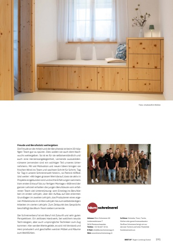 BEST OF BEST OFRegion Lenzburg und Seetal Region Lenzburg-Seetal 1912Adresse: Blum Schreinerei AGLindenmattstrasse 75616 MeisterschwandenTelefon: +41 56 667 10 16E-Mail: info@blumschreinereiag.chWeb: www.blumschreinereiag.chIn K%u00fcrze: Schr%u00e4nke, T%u00fcren, Tische, K%u00fcchen oder ganze Innenausbauten: Die Blum Schreinerei fertigt mit modernster Technik und hoher Flexibilit%u00e4t Kundenw%u00fcnsche an. Freude und Berufsstolz weitergebenDie Freude an der Arbeit und der Berufsstolz ist beim 30-k%u00f6pfi gen Team gut zu sp%u00fcren. Dies wollen sie auch dem Nachwuchs weitergeben. So ist es f%u00fcr sie selbstverst%u00e4ndlich und auch eine Herzensangelegenheit, Lernende auszubilden. %u00abUnsere Lernenden sind ein wichtiger Teil unseres Unternehmens. Mit viel Motivation und neuen Ideen bringen sie frischen Wind ins Team und wachsen Schritt f%u00fcr Schritt, Tag f%u00fcr Tag in unsere Schreinerwelt hinein%u00bb, so Patrick Hilfi ker. Und weiter: %u00abWir legen grossen Wert darauf, dass sie aktiv in Projekte eingebunden sind und echte Erfahrungen sammeln. Vom ersten Entwurf bis zur fertigen Montage.%u00bb W%u00e4hrend der ganzen Lehrzeit erhalten die jungen Berufsleute vom erfahrenen Team viel Unterst%u00fctzung: vom Einstieg ins Berufsleben im ersten Lehrjahr, %u00fcber den Aufbau auf den erlernten Grundlagen im zweiten Lehrjahr, das Produzieren eines eigenen M%u00f6belst%u00fccks im dritten Lehrjahr bis zum selbstst%u00e4ndigen Arbeiten im vierten Lehrjahr. Zum Zeitpunkt des Gespr%u00e4chs besch%u00e4ftigt das Blum-Team sieben Lernende. Der Schreinerberuf ist ein Beruf mit Zukunft und sehr guten Perspektiven. Ein zeitloses Handwerk, bei welchem neuste Technologien, aber auch urspr%u00fcngliche Techniken zum Zug kommen. Hier werden Werte gelebt, es wird mit Verstand und Herz produziert und geschaffen werden M%u00f6bel und R%u00e4ume zum Wohlf%u00fchlen.Fotos: inhaltsstoff.ch Wohlen