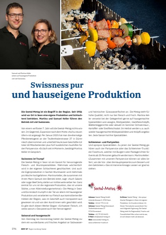 196 5 BEST OF BEST OF Portrait xxx Region Lenzburg-Seetal Swissness pur und hauseigene ProduktionAdresse: Seetal-Metzg GmbHUnterdorfstrasse 5, 5703 SeonTelefon: +41 62 775 11 24Adresse: Seetal-Metzg D%u00fcrren%u00e4schTeufenthalerstrasse 275724 D%u00fcrren%u00e4schTelefon: +41 79 523 46 01E-Mail: info@seetal-metzg.chWeb: www.seetal-metzg.ch,www.schlemmer-truckli.chIn K%u00fcrze: Seetal-Metzg %u2013 die sympathische Metzgerei in Seon mit eigener Produktion. Im Grunde ist dieser %u00abIn K%u00fcrze%u00bb-Text absolut ausreichend. Nur noch folgende Erg%u00e4nzung: Die SeetalMetzg steht f%u00fcr Regionalit%u00e4t, Frische und Freundlichkeit! Wer schon mal da war, ist sich dessen mehr als bewusst.Die Seetal-Metzg ist ein Begriff in der Region. Seit 1956 wird vor Ort in Seon eine eigene Produktion und Schlachterei betrieben. Martina und Samuel Keller f%u00fchren den Betrieb mit viel Swissness. Von einem verflixten 7. Jahr will die Seetal-Metzg nichts wissen. Im Gegenteil, Expansion nach dem Motto %u00abAuf zu neuen Ufern%u00bb ist angesagt. Per Januar 2025 hat man die ehemalige Pferdemetzgerei an der Teufenthalerstrasse 27 in D%u00fcrren%u00e4sch %u00fcbernommen und unterh%u00e4lt heute zwei Gesch%u00e4fte mit total 18 Mitarbeitenden plus f%u00fcnf zus%u00e4tzlichen Aushilfen f%u00fcr den Partyservice. %u00abEs l%u00e4uft viel im Moment%u00bb, best%u00e4tigt Martina Keller im Gespr%u00e4ch.Swissness ist TrumpfDie Seetal-Metzg in Seon ist ein Garant f%u00fcr hervorragende Fleisch- und Wurstspezialit%u00e4ten. Mehrmals w%u00f6chentlich wird in der eigenen Schlachterei geschlachtet. Und auch die Eigenproduktion in Sachen Wurstwaren wird mehrmals pro Woche hochgefahren. Martina Keller, die zusammen mit ihrem Mann Samuel den Betrieb leitet, sagt: %u00abAuch Salami oder sogar Beef Jerky stellen wir mittlerweile selber her. Ganz zentral f%u00fcr uns ist die regionale Produktion, das ist unsere St%u00e4rke, unser Alleinstellungsmerkmal.%u00bb Die Metzg in Seon und D%u00fcrren%u00e4sch trumpft in der Tat vor allem mit hauseigener Produktion und verarbeitet nur Fleisch aus kontrollierten Betrieben der Region, was im Gesch%u00e4ft auch transparent ausgewiesen ist und von den Kund:innen sehr gesch%u00e4tzt wird. Es gibt doch diesen Werbe-Slogan: %u00abSchweizer Fleisch, ich weiss warum.%u00bb Das passt auch hier hervorragend! Saisonal und hausgemachtVon Dienstag bis Donnerstag bietet die Seetal-Metzg zudem ein wunderbares und frisches Angebot an Salzwasserund heimischen S%u00fcsswasserfi schen an. Die Metzg steht f%u00fcr hohe Qualit%u00e4t; nicht nur bei Fleisch und Fisch. Martina Keller verweist bei der Gelegenheit gerne auf hausgemachte Spezialit%u00e4ten wie Lasagne, R%u00f6stipasteten, Hackfleischz%u00f6pfli, Bl%u00e4tterteiggerichte oder aktuell im Sommer Ochsenmaul-, Kartoffel- oder Siedfleischsalat. Im Herbst werden u.a. auch wieder hausgemachte Wildspezialit%u00e4ten und Kn%u00f6pfli angeboten. Jede Saison hat ihre Spezialit%u00e4ten.Schlemmer- und PartyzeitenUnd apropos Spezialit%u00e4ten. Zu jenen der Seetal-Metzg geh%u00f6ren auch der Partyservice oder das Schlemmer-Truckli: der Foodtruck, welcher mit Burgern oder Pastagerichten f%u00fcr Events ab 25 Personen gebucht werden kann. Martina Keller: %u00abZusammen mit unserem Partyservice k%u00f6nnen wir alles liefern; von der Vor- %u00fcber die Hauptspeise bis zum Dessert und den Getr%u00e4nken.%u00bb Das ist mal eine Ansage. Lassen wir grad so stehen.Samuel und Martina Keller setzen auf hauseigene Produktion und viel Swissness.