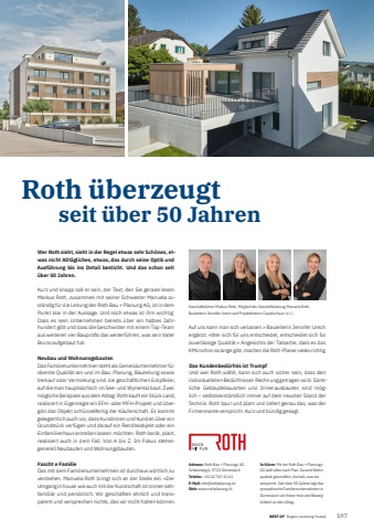 BEST OF Region Lenzburg-Seetal 197BEST OF Portrait xxx 1Roth %u00fcberzeugt seit %u00fcber 50 JahrenAdresse: Roth Bau + Planungs AGSchanzweg 6, 5724 D%u00fcrren%u00e4schTelefon: +41 62 767 61 61E-Mail: info@rothplanung.chWeb: www.rothplanung.chIn K%u00fcrze: Mit der Roth Bau + Planungs AG l%u00e4uft alles nach Plan. Da wird Wohnqualit%u00e4t geschaffen, die h%u00e4lt, was sie verspricht. Seit %u00fcber 50 Jahren legt das sympathische Familienunternehmen in D%u00fcrren%u00e4sch viel Know-how und Beweglichkeit an den Alltag. Wer Roth sieht, sieht in der Regel etwas sehr Sch%u00f6nes, etwas nicht Allt%u00e4gliches, etwas, das durch seine Optik und Ausf%u00fchrung bis ins Detail besticht. Und das schon seit %u00fcber 50 Jahren.Kurz und knapp soll er sein, der Text, den Sie gerade lesen. Markus Roth, zusammen mit seiner Schwester Manuela zust%u00e4ndig f%u00fcr die Leitung der Roth Bau + Planung AG, ist in dem Punkt klar in der Aussage. Und noch etwas ist ihm wichtig: Dass es sein Unternehmen bereits %u00fcber ein halbes Jahrhundert gibt und dass die Geschwister mit einem Top-Team aus weiteren vier Bauprofi s das weiterf%u00fchren, was sein Vater Bruno aufgebaut hat.Neubau und WohnunsgsbautenDas Familienunternehmen steht als Generalunternehmer f%u00fcr oberste Qualit%u00e4t am und im Bau. Planung, Bauleitung sowie Verkauf oder Vermietung sind die gesch%u00e4ftlichen Eckpfeiler, auf die man haupts%u00e4chlich im See- und Wynental baut. Zwei m%u00f6gliche Beispiele aus dem Alltag: Roth kauft ein St%u00fcck Land, realisiert in Eigenregie ein EFH- oder MFH-Projekt und %u00fcbergibt das Objekt schl%u00fcsselfertig der K%u00e4uferschaft. Es kommt gelegentlich auch vor, dass Kundinnen und Kunden %u00fcber ein Grundst%u00fcck verf%u00fcgen und darauf ein Renditeobjekt oder ein Einfamilienhaus erstellen lassen m%u00f6chten. Roth ber%u00e4t, plant, realisiert auch in dem Fall. Von A bis Z. Im Fokus stehen generell Neubauten und Wohnungsbauten.Fascht e FamilieDas mit dem Familienunternehmen ist durchaus w%u00f6rtlich zu verstehen. Manuela Roth bringt sich an der Stelle ein: %u00abDer Umgang in house wie auch mit der Kundschaft ist immer sehr famili%u00e4r und pers%u00f6nlich. Wir gesch%u00e4ften ehrlich und transparent und versprechen nichts, das wir nicht halten k%u00f6nnen. Auf uns kann man sich verlassen.%u00bb Bauleiterin Jennifer Urech erg%u00e4nzt: %u00abWer sich f%u00fcr uns entscheidet, entscheidet sich f%u00fcr zuverl%u00e4ssige Qualit%u00e4t.%u00bb Angesichts der Tatsache, dass es das KMU schon so lange gibt, machen die Roth-Planer vieles richtig.Das Kundenbed%u00fcrfnis ist TrumpfUnd wer Roth w%u00e4hlt, kann sich auch sicher sein, dass den individuellsten Bed%u00fcrfnissen Rechnung getragen wird. S%u00e4mtliche Geb%u00e4udebauarten und Innenausbauten sind m%u00f6glich %u2013 selbstverst%u00e4ndlich immer auf dem neusten Stand der Technik. Roth baut und plant und liefert genau das, was der Firmenname verspricht. Kurz und b%u00fcndig gesagt.Gesch%u00e4ftsf%u00fchrer Markus Roth, Mitglied der Gesch%u00e4ftsleitung Manuela Roth, Bauleiterin Jennifer Urech und Projektleiterin Claudia Hauri (v. l.)