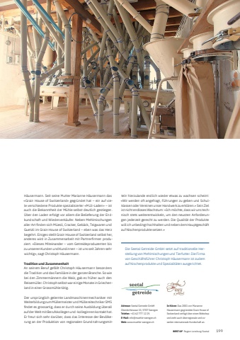 BEST OF Region Lenzburg-Seetal 199BEST OF Portrait xxx 2H%u00e4usermann. Seit seine Mutter Marianne H%u00e4usermann das %u00abGrain House of Switzerland%u00bb gegr%u00fcndet hat %u2013 ein auf viele verschiedene Produkte spezialisierter %u00abM%u00fcli-Laden%u00bb %u2013 ist auch die Bekanntheit der M%u00fchle selbst deutlich gestiegen. %u00dcber den Laden erfolgt vor allem die Belieferung der Endkundschaft und Wiederverk%u00e4ufer. Neben Mehlmischungen aller Art fi nden sich M%u00fcesli, Cracker, Geb%u00e4ck, Teigwaren und Guetzli im Grain House of Switzerland %u2013 eben was das Herz begehrt. Einiges stellt Grain House of Switzerland selbst her, anderes wird in Zusammenarbeit mit Partnerfi rmen produziert. %u00abDieses Miteinander %u2013 vom Getreideproduzenten bis zu unseren Kunden und Kundinnen %u2013 ist uns seit Jahren sehr wichtig%u00bb, sagt Christoph H%u00e4usermann.Tradition und ZusammenhaltAn seinem Beruf gef%u00e4llt Christoph H%u00e4usermann besonders die Tradition und das Famili%u00e4re in der ganzen Branche. So wie bei den Zimmerm%u00e4nnern die Walz, gab es fr%u00fcher auch den Reisem%u00fcller. Christoph selbst war einige Monate in Griechenland in einer Grossm%u00fchle t%u00e4tig.Der urspr%u00fcnglich gelernte Landmaschinenmechaniker mit Weiterbildung zum M%u00fcllermeister und M%u00fcllereitechniker SMS fi ndet es grossartig, dass er durch seine Ausbildung %u00fcberall auf der Welt mit Berufskollegen und -kolleginnen kontakt hat. Er freut sich sehr dar%u00fcber, dass das Interesse der Bev%u00f6lkerung an der Produktion von regionalen Grundnahrungsmitteln hierzulande endlich wieder etwas zu wachsen scheint: %u00abWir werden oft angefragt, F%u00fchrungen zu geben und Schulklassen oder Vereinen unser Handwerk zu erkl%u00e4ren.%u00bb Sein Ziel ist nicht endloses Wachstum: %u00abIch m%u00f6chte, dass wir uns technisch stets weiterentwickeln, um den neusten Anforderungen jederzeit gerecht zu werden. Die Qualit%u00e4t der Produkte will ich unbedingt hochhalten und neben dem Hauptgesch%u00e4ft auf Nischenprodukte setzen.%u00bbDie Seetal Getreide GmbH setzt auf traditionelle Herstellung von Mehlmischungen und Tierfutter. Die Firma von Gesch%u00e4ftsf%u00fchrer Christoph H%u00e4usermann ist zudem auf Nischenprodukte und Spezialit%u00e4ten ausgerichtet.Adresse: Seetal Getreide GmbHOberdorfstrasse 33, 5707 SeengenTelefon: +41 62 777 12 25 E-Mail: info@muehle-seengen.chWeb: www.muehle-seengen.chIn K%u00fcrze: Das 2001 von Marianne H%u00e4usermann gegr%u00fcndete Grain House of Switzerland verf%u00fcgt %u00fcber einen Webshop und zieht auch %u00fcberregionale und zuweilen internationale Kundschaft an.