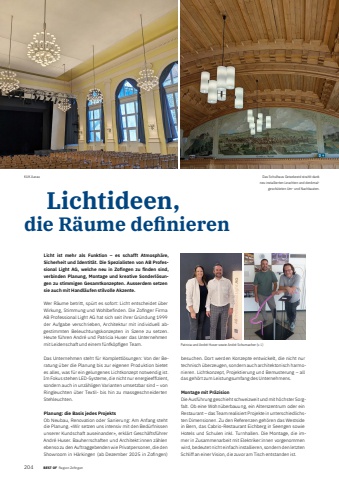 204 BEST OF BEST OF Portrait xxx Region Zofingen Lichtideen, die R%u00e4ume defi nieren Licht ist mehr als Funktion %u2013 es schafft Atmosph%u00e4re, Sicherheit und Identit%u00e4t. Die Spezialisten von AB Professional Light AG, welche neu in Zofi ngen zu fi nden sind, verbinden Planung, Montage und kreative Sonderl%u00f6sungen zu stimmigen Gesamtkonzepten. Ausserdem setzen sie auch mit Handl%u00e4ufen stilvolle Akzente.Wer R%u00e4ume betritt, sp%u00fcrt es sofort: Licht entscheidet %u00fcber Wirkung, Stimmung und Wohlbefi nden. Die Zofi nger Firma AB Professional Light AG hat sich seit ihrer Gr%u00fcndung 1999 der Aufgabe verschrieben, Architektur mit individuell abgestimmten Beleuchtungskonzepten in Szene zu setzen. Heute f%u00fchren Andr%u00e9 und Patricia Huser das Unternehmen mit Leidenschaft und einem f%u00fcnfk%u00f6pfi gen Team. Das Unternehmen steht f%u00fcr Komplettl%u00f6sungen: Von der Beratung %u00fcber die Planung bis zur eigenen Produktion bietet es alles, was f%u00fcr ein gelungenes Lichtkonzept notwendig ist. Im Fokus stehen LED-Systeme, die nicht nur energieeffi zient, sondern auch in unz%u00e4hligen Varianten umsetzbar sind %u2013 von Ringleuchten %u00fcber Textil- bis hin zu massgeschneiderten Stehleuchten.Planung: die Basis jedes ProjektsOb Neubau, Renovation oder Sanierung: Am Anfang steht die Planung. %u00abWir setzen uns intensiv mit den Bed%u00fcrfnissen unserer Kundschaft auseinander%u00bb, erkl%u00e4rt Gesch%u00e4ftsf%u00fchrer Andr%u00e9 Huser. Bauherrschaften und Architekt:innen z%u00e4hlen ebenso zu den Auftraggebenden wie Privatpersonen, die den Showroom in H%u00e4rkingen (ab Dezember 2025 in Zofi ngen) besuchen. Dort werden Konzepte entwickelt, die nicht nur technisch %u00fcberzeugen, sondern auch architektonisch harmonieren. Lichtkonzept, Projektierung und Bemusterung %u2013 all das geh%u00f6rt zum Leistungsumfang des Unternehmens.Montage mit Pr%u00e4zisionDie Ausf%u00fchrung geschieht schweizweit und mit h%u00f6chster Sorgfalt. Ob eine Wohn%u00fcberbauung, ein Alterszentrum oder ein Restaurant %u2013 das Team realisiert Projekte in unterschiedlichsten Dimensionen. Zu den Referenzen geh%u00f6ren das Westside in Bern, das Cabrio-Restaurant Eichberg in Seengen sowie Hotels und Schulen inkl. Turnhallen. Die Montage, die immer in Zusammenarbeit mit Elektriker:innen vorgenommen wird, bedeutet nicht einfach installieren, sondern den letzten Schliff an einer Vision, die zuvor am Tisch entstanden ist.Patricia und Andr%u00e9 Huser sowie Andr%u00e9 Schumacher (v. l.)KUK Aarau Das Schulhaus Geiselweid strahlt dank neu installierten Leuchten und denkmalgesch%u00fctzten Um- und Nachbauten.