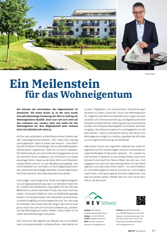 BEST OF BEST OF %u00dcberregional Portrait xxx 1941Die Schweiz hat entschieden: Der Eigenmietwert ist Geschichte. Mit einem klaren Ja an der Urne wurde eine jahrzehntelange Forderung des HEV im Auftrag der Wohneigent%u00fcmer Realit%u00e4t. Doch man ruht sich nicht auf den Lorbeeren aus, sondern setzt sich weiter f%u00fcr das Wohneigentum ein. Eine Mitgliedschaft beim Verband lohnt sich deshalb mehr denn je.%u00abIch bin sehr erleichtert%u00bb, erkl%u00e4rt Markus Meier, Direktor des HEV (Hauseigent%u00fcmerverband). %u00abWir haben fast zwanzig Jahre gek%u00e4mpft. Jetzt ist dieses Ziel erreicht %u2013 eine Mehrheit der Schweizer Stimmb%u00fcrger hat der Abschaffung dieser %u2039Geistersteuer%u203a zugestimmt. Daf%u00fcr bin ich enorm dankbar.%u00bb Mit Volksinitiativen und unerm%u00fcdlichem Engagement wurde der politische Druck aufgebaut, der schliesslich zur Gesetzesvorlage f%u00fchrte. Diese wurde Ende 2024 vom Parlament verabschiedet und nun von der Bev%u00f6lkerung best%u00e4tigt. %u00abNat%u00fcrlich k%u00e4mpften wir nicht allein: ein breit abgest%u00fctztes Komitee unterst%u00fctzte das Anliegen ebenfalls.%u00bb Etwas liegt Markus Meier bei %u00abseinem%u00bb HEV dabei besonders am Herzen.%u00abUns pr%u00e4gen zwar b%u00fcrgerliche Ideale wie Eigentumsgarantie und Eigenverantwortung. Doch wir betreiben keine Partei- sondern klar Sachpolitik.%u00bb Dazu geh%u00f6rt f%u00fcr den HEV das Bekenntnis zu einem zentralen Prinzip, das unser Land ausmacht: %u00abSchweizer Politik ist nicht von Radikalit%u00e4t gepr%u00e4gt, sondern von Kompromissen, die niemanden ausschliessen und damit tragf%u00e4hig und breit abgest%u00fctzt sind. Nur das sorgt f%u00fcr Stabilit%u00e4t.%u00bb Die Freude %u00fcber den Sieg an der Urne ist zwar gross. Doch man ruht sich nicht auf Lorbeeren aus, sondern will das Wohneigentum weiter st%u00e4rken. Diese Arbeit ist mit vielen Herausforderungen verbunden.%u00abDer Traum von den eigenen vier W%u00e4nden war, ist und bleibt teuer und anspruchsvoll%u00bb, so Markus Meier. %u00abHier stehen wir Ein Meilenstein f%u00fcr das Wohneigentum unseren Mitgliedern mit verschiedenen Dienstleistungen beratend zur Seite.%u00bb Damit der Traum vom Wohneigentum f%u00fcr m%u00f6glichst viele Menschen Realit%u00e4t wird, fungiert der HEV zus%u00e4tzlich als Interessenvertretung und begleitet politische Prozesse auf allen Ebenen: %u00ab%u00dcberregulierung, b%u00fcrokratische H%u00fcrden und komplexe Baueingaben erschweren den Wohnungsbau. Da schauen wir genau hin und engagieren uns auf allen Ebenen %u2013 seien es Gemeinde, Kanton oder Bund.%u00bb Um Wohneigentum m%u00f6glich zu machen, appelliert der HEV aber auch an Eigenverantwortung und Solidarit%u00e4t.%u00abWer seinen Traum vom Eigenheim realisiert hat, sollte ihn eigentlich auch f%u00fcr andere m%u00f6glich machen und deshalb von ungerechtfertigten Einsprachen absehen %u2013 f%u00fcr unseren Zusammenhalt im Verband ist das wichtig.%u00bb Dieser (auch emotionale) Punkt macht f%u00fcr Markus Meier den HEV aus: %u00abIch engagiere mich jetzt seit %u00fcber dreissig Jahren f%u00fcr das Wohneigentum und sp%u00fcre das immer wieder %u2013 so unterschiedlich wir sind, Wohneigentum vereint und eint uns. Und Einigkeit macht stark.%u00bb Also ganz egal ob Sie schon Eigent%u00fcmer sind oder es werden wollen: Melden Sie sich noch heute beim HEV an. Es lohnt sich!Adresse: HEV SchweizSeefeldstrasse 60, 8032 Z%u00fcrichTelefon: +41 44 254 90 20E-Mail: info@hev-schweiz.chWeb: www.hev-schweiz.ch,www.der-hauseigent%u00fcmer.chIn K%u00fcrze: Der HEV Schweiz z%u00e4hlt rund 340 000 Mitglieder mit %u00fcber 100 Regional- und Kantonalsektionen. Seit %u00fcber 100 Jahren setzt er sich f%u00fcr die F%u00f6rderung und Erhaltung des Wohnund Grundeigentums ein. Markus Meier