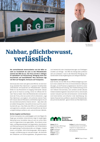 BEST OF Region Zofingen 209BEST OF Portrait xxx 45Nahbar, pfl ichtbewusst, verl%u00e4sslichDie wertsch%u00e4tzende Kommunikation und die N%u00e4he sowohl zur Kundschaft als auch zu den Mitarbeitenden zeichnet die HRG AG aus. Die Firma mit Sitz in Zofi ngen ist spezialisiert auf Hauswartung, Reinigung sowie Gartenunterhalt und Gesch%u00e4ftsleiter Marc Bachmann legt viel Wert auf Teamgeist, Vertrauen und Transparenz.Seit etwas %u00fcber einem Jahr gibt es die HRG AG. Vor der Gr%u00fcndung arbeitete Marc Bachmann in grossen Einzelhandelsunternehmen mit tausenden von Mitarbeitenden. %u00abDamals fehlte mir das Pers%u00f6nliche im Umgang miteinander. Deswegen ist es mir heute so wichtig, immer ein offenes Ohr f%u00fcr mein Team zu haben. Denn die Mitarbeitenden sind das Herzst%u00fcck der Firma, ohne sie w%u00fcrde nichts funktionieren%u00bb, sagt Marc Bachmann und erg%u00e4nzt: %u00abIch achte bei meinem Team sehr darauf, dass die Motivation und Arbeitslust gross ist und die zwischenmenschliche Chemie stimmt %u2013 dass eben alle am selben Strang ziehen. Das zahlt sich dann auch f%u00fcr unsere Kundschaft aus.%u00bb Das Motto des KMU ist: So professionell und organisiert zu arbeiten, wie es bei Grossfi rmen der Fall ist und gelichzeitig so nahbar zu sein, wie ein Einmann-Betrieb. Breites Angebot und Wachstum Die Kernkompetenz des unabh%u00e4ngigen und in der Region Zofi ngen gut vernetzten Unternehmens liegt im langfristigen Werterhalt einer Immobilie. Dadurch wird ein echter Mehrwert f%u00fcr Eigent%u00fcmer:innen geschaffen. Ob einfache Unterhalts- und Reparaturarbeiten, die Organisation, Koordination und %u00dcberwachung von Servicearbeiten und Drittanbietern, die regelm%u00e4ssige Funktionskontrolle von Anlagen, Installationen und Ger%u00e4ten, Kehrichtentsorgungen, Wohnungsr%u00e4umungen und Betreuung von Leerwohnungen, die Kontrolle der Liftkabinen und Sicherungsk%u00e4sten, die gesamte Hausund Heiztechnik oder Urlaubsvertretungen von Drittliegenschaften auf Anfrage %u2013 die HRG AG erledigt alles professionell und verl%u00e4sslich. Auch in den Bereichen Reinigung und Gartenarbeit ist das Angebot gross und stetig am Wachsen. Topmodern und organisiertZwei Punkte, die die HRG AG zur Effi zienzsteigerung nutzt: Zum einen arbeitet die Firma mit fortschrittlichen Softwarel%u00f6sungen, um die Prozesse zu digitalisieren. Das f%u00fchrt zu einer besseren Ressourcennutzung, einer Kostensenkung und einem h%u00f6heren Serviceniveau. Zum anderen werden akkubetriebene Ger%u00e4te eingesetzt. Das schont nicht nur die Umwelt, sondern reduziert auch die L%u00e4rmemissionen. Und die Ger%u00e4te sind meist leichter und einfacher in der Handhabung. Von beiden Massnahmen profi tieren sowohl die Mitarbeitenden als auch die Kundschaft %u2013 ganz im Sinne von Marc Bachmann. Adresse: HRG AGNationalbahnweg 6, 4800 Zofi ngenTelefon: +41 62 745 17 00E-Mail: info@hrgag.chWeb: www.hrgag.ch Instagram: hrgag.chLinkedin: HRG AGIn K%u00fcrze: Als moderne Hauswartung im Mittelland k%u00fcmmert sich die HRG%u00a0AG fachgerecht um Liegenschaften und geht auch gern auf individuelle W%u00fcnsche der Kundschaft ein.HauswartungReinigungGartenunterhaltMarc Bachmann, Gesch%u00e4ftsf%u00fchrer