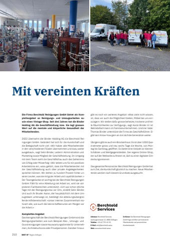 210 1 BEST OF BEST OF Portrait xxx Region ZofingenMit vereinten Kr%u00e4ftenAdresse: Berchtold ServicesAarburgerstrasse 13, 4800 Zofi ngenTelefon: +41 62 751 42 35E-Mail: info@berchtold.swissWeb: www.berchtold.swissIn K%u00fcrze: Die Berchtold Reinigungen GmbH legt viel Wert auf motivierte Mitarbeitende und pers%u00f6nlichen Kundenkontakt. Die Firma Berchtold Reinigungen GmbH bietet ein Komplettangebot an Reinigungs- und Umzugsarbeiten sowie einen Vintage-Shop. Seit drei Jahren hat die Binder Holding AG die Gesch%u00e4ftsleitung inne. Sie legt grossen Wert auf die mentale und k%u00f6rperliche Gesundheit der Mitarbeitenden.2022 %u00fcbernahm die Binder Holding AG die Berchtold Reinigungen GmbH. Ge%u00e4ndert hat sich f%u00fcr die Kundschaft und die Belegschaft nicht viel: %u00abWir haben alle Mitarbeitenden in den verschiedenen Filialen %u00fcbernommen und dazu weiter ausgebaut%u00bb, sagt Selin Binder, Leiterin Administration und Marketing sowie Mitglied der Gesch%u00e4ftsleitung. Im Umgang mit dem Team sieht die Gesch%u00e4ftsfrau auch das Geheimnis von Erfolg oder Misserfolg: %u00abWir setzen uns f%u00fcr ein positives Arbeitsklima ein, wozu geh%u00f6rt, dass die Mitarbeitenden mit der Gesch%u00e4ftsleitung auch %u00fcber private Angelegenheiten sprechen k%u00f6nnen. Wir stehen zu hundert Prozent hinter unseren Leuten, was sie mit guter Arbeit und Loyalit%u00e4t danken.%u00bb Der Teamgedanke ist wichtig bei der Berchtold Reinigungen GmbH: F%u00e4llt f%u00fcr eine Abteilung viel Arbeit an, wird sie von anderen Fachbereichen unterst%u00fctzt. %u00abIch war schon etliche Tage mit der Reinigungscrew vor Ort%u00bb, erz%u00e4hlt Selin Binder. Und auch ihr Bruder Aaron, der haupts%u00e4chlich mit dem Umzugsteam unterwegs ist, best%u00e4tigt die abteilungs%u00fcbergreifende Hilfsbereitschaft: %u00abUnser interner Zusammenhalt motiviert alle, wie auch die kleine Kaffeerunde am Morgen vor der Arbeit.%u00bb Komplettes AngebotDas Kerngesch%u00e4ft der Berchtold Reinigungen GmbH sind die Reinigungsarbeiten wie zum Beispiel Abo-, Umzugs- und Grundreinigungen sowie Hauswartungsdienste f%u00fcr Unternehmen, Architekturb%u00fcros oder Privatpersonen. Dar%u00fcber hinaus gibt es noch ein weiteres Angebot: %u00abWas viele nicht wissen, ist, dass wir auch die M%u00f6glichkeit bieten, M%u00f6bel bei uns einzulagern. Wir stellen daf%u00fcr grosse beheizte, trockene und helle R%u00e4umlichkeiten zur Verf%u00fcgung%u00bb, sagt Aaron Binder. Er ist Betriebsfachmann im Familienunternehmen. Und der Vater Thomas Binder unterst%u00fctzt die Firma als Gesch%u00e4ftsf%u00fchrer. Er gibt sein Know-how gern an die n%u00e4chste Generation weiter. %u00dcbrigens gibt es auch ein Brockenhaus: Es ist %u00fcber 1000 Quadratmeter gross und neu sechs Tage die Woche, von Montag bis Samstag, ge%u00f6ffnet. Es bietet eine Vielzahl an kleinen Sch%u00e4tzen und Wertgegenst%u00e4nden. Der eigene Online-Shop, der auf der Webseite zu fi nden ist, l%u00e4dt zu einer digitalen Entdeckungsreise ein. Das gesamte Personal der Berchtold Reinigungen GmbH hat zum Ziel, die Kundschaft gl%u00fccklich zu machen. Neue Mitarbeitende werden nach diesem Grundsatz ausgesucht.