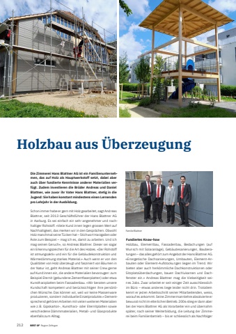 212 1 BEST OF BEST OF Portrait xxx Region ZofingenHolzbau aus %u00dcberzeugung Die Zimmerei Hans Blattner AG ist ein Familienunternehmen, das auf Holz als Hauptwerkstoff setzt, dabei aber auch %u00fcber fundierte Kenntnisse anderer Materialien verf%u00fcgt. Zudem investieren die Br%u00fcder Andreas und Daniel Blattner, wie zuvor ihr Vater Hans Blattner, stetig in die Jugend: Sie haben konstant mindestens einen Lernenden pro Lehrjahr in der Ausbildung. Schon immer habe er gern mit Holz gearbeitet, sagt Andreas Blattner, seit 2013 Gesch%u00e4ftsf%u00fchrer der Hans Blattner AG in Aarburg. Es sei einfach ein sehr angenehmer und nachhaltiger Rohstoff. %u00abViele Kund:innen legen grossen Wert auf Nachhaltigkeit, das merken wir in den Gespr%u00e4chen. Obwohl Holz manchmal seine T%u00fccken hat %u2013 Stichwort Harzgallen oder %u00c4ste zum Beispiel %u2013 mag ich es, damit zu arbeiten. Und ich mag seinen Geruch%u00bb, so Andreas Blattner. Dieser sei sogar ein Erkennungszeichen f%u00fcr die Art des Holzes. %u00abDer Rohstoff ist atmungsaktiv und ein f%u00fcr die Geb%u00e4udekonstruktion und W%u00e4rmed%u00e4mmung starkes Material.%u00bb Auch wenn er von den Qualit%u00e4ten von Holz %u00fcberzeugt und fasziniert von B%u00e4umen in der Natur ist, geht Andreas Blattner mit seiner Crew gerne auf Kund:innen ein, die andere Materialien bevorzugen: zum Beispiel Eternit (gebundene Zementfaserplatten) oder etwa Kunstharzplatten beim Fassadenbau. %u00abWir beraten unsere Kundschaft kompetent und ber%u00fccksichtigen ihre pers%u00f6nlichen W%u00fcnsche. Das k%u00f6nnen wir, weil wir keine Massenware produzieren, sondern individuelle Einzelprodukte.%u00bb Dementsprechend geh%u00f6ren Arbeiten mit vielen weiteren Materialien wie z. B. Gipskarton-, Kunstharz- oder Eternitplatten sowie verschiedene D%u00e4mmmaterialien, Metall- und Glas produkte ebenfalls zum Alltag.Fundiertes Know-how Holzbau, Elementbau, Fassadenbau, Bedachungen (auf Wunsch mit Solaranlage), Geb%u00e4udesanierungen, Bauberatungen %u2013 das alles geh%u00f6rt zum Angebot der Hans Blattner%u00a0AG. %u00abEnergetische Dachsanierungen, Umbauten, Element-Anbauten oder Element-Aufstockungen liegen im Trend. Wir bieten aber auch herk%u00f6mmliche Dachkonstruktionen oder Sitzplatz%u00fcberdachungen, bauen Dachlukarnen und Dachfenster ein.%u00bb Andreas Blattner mag die Vielseitigkeit seines Jobs. Zwar arbeitet er seit einiger Zeit ausschliesslich im B%u00fcro%u00a0%u2013 etwas anderes liege leider nicht drin. Trotzdem kennt er jeden Arbeitsschritt seiner Mitarbeitenden, weiss, worauf es ankommt. Seine Zimmermannlehre absolvierte er bewusst nicht im elterlichen Betrieb. 2006 stieg er dann aber bei der Hans Blattner AG als Vorarbeiter ein und %u00fcbernahm sp%u00e4ter, nach seiner Weiterbildung, die Leitung der Zimmerei beim Familienbetrieb %u2013 bis er schliesslich als Nachfolger Familie Blattner