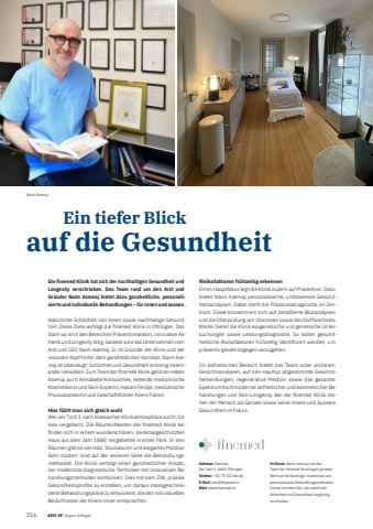 216 1 BEST OF BEST OF Portrait xxx Region Zofingen Ein tiefer Blick auf die GesundheitDie fi nemed Klinik hat sich der nachhaltigen Gesundheit und Longevity verschrieben. Das Team rund um den Arzt und Gr%u00fcnder Naim Azemaj bietet dazu ganzheitliche, personalisierte und individuelle Behandlungen %u2013 f%u00fcr innen und aussen. Nat%u00fcrliche Sch%u00f6nheit von innen sowie nachhaltige Gesundheit: Diese Ziele verfolgt die fi nemed Klinik in Oftringen. Das Start-up ist in den Bereichen Pr%u00e4ventivmedizin, innovative %u00c4sthetik und Longevity t%u00e4tig. Geleitet wird das Unternehmen vom Arzt und CEO Naim Azemaj. Er ist Gr%u00fcnder der Klinik und der vision%u00e4re Kopf hinter dem ganzheitlichen Konzept. Naim Azemaj ist %u00fcberzeugt: Sch%u00f6nheit und Gesundheit sind eng miteinander verwoben. Zum Team der fi nemed Klinik geh%u00f6ren neben Azemaj auch Annabelle Korzuschek, leitende medizinische Kosmetikerin und Skin-Expertin, Hasani Ferdije, medizinische Praxisassistentin und Gesch%u00e4ftsf%u00fchrer Azemi Fatmir.Hier f%u00fchlt man sich gleich wohlWer am Tych 1 nach klassischer Klinikatmosph%u00e4re sucht, tut dies vergebens. Die R%u00e4umlichkeiten der fi nemed Klinik befi nden sich in einem wundersch%u00f6nen, denkmalgesch%u00fctzten Haus aus dem Jahr 1880, eingebettet in einen Park. In den R%u00e4umen gibt es viel Holz, Stuckaturen und elegantes Mobiliar. Sehr modern sind auf der anderen Seite die Behandlungsmethoden. Die Klinik verfolgt einen ganzheitlichen Ansatz, der modernste diagnostische Techniken mit innovativen Behandlungsmethoden kombiniert. Dies mit dem Ziel, pr%u00e4zise Gesundheitsprofi le zu erstellen, um daraus massgeschneiderte Behandlungspl%u00e4ne zu entwickeln, die den individuellen Bed%u00fcrfnissen der Klient:innen entsprechen. Risikofaktoren fr%u00fchzeitig erkennenEinen Hauptfokus legt die Klinik zudem auf Pr%u00e4vention. Dazu bietet Naim Azemaj personalisierte, umfassende Gesundheitsanalysen. Dabei steht die Pr%u00e4zisionsdiagnostik im Zentrum. Diese konzentriert sich auf detaillierte Blutanalysen und die %u00dcberpr%u00fcfung von Vitaminen sowie des Stoffwechsels. Weiter bietet die Klinik epigenetische und genetische Untersuchungen sowie Leistungsdiagnostik. So sollen gesundheitliche Risikofaktoren fr%u00fchzeitig identifi ziert werden, um pr%u00e4ventiv gezielt dagegen vorzugehen. Im %u00e4sthetischen Bereich bietet das Team unter anderem Gesichtsanalysen, auf den Hauttyp abgestimmte Gesichtsbehandlungen, regenerative Medizin sowie das gesamte Spektrum hochmoderner %u00e4sthetischer und kosmetischer Behandlungen und Skin-Longevity. Bei der fi nemed Klinik stehen der Mensch als Ganzes sowie seine innere und %u00e4ussere Gesundheit im Fokus.Adresse: fi nemedAm Tych 1, 4665 OftringenTelefon: +41 75 522 66 66E-Mail: info@fi nemed.chWeb: www.fi nemed.chIn K%u00fcrze: Naim Azemaj und das Team der fi nemed Klinik legen grossen Wert auf hochwertige, modernste und personalisierte Behandlungsmethoden. Immer mit dem Ziel, die nat%u00fcrliche Sch%u00f6nheit und Gesundheit langfristig zu erhalten.Naim Azemaj