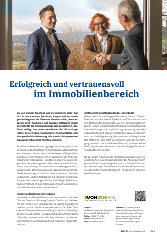 BEST OF Aus der Nachbarschaft BEST OF Portrait xxx 2232Erfolgreich und vertrauensvoll im ImmobilienbereichAdresse: von D%u00e4niken Treuhand + Verwaltungen AGK%u00fcrzestrasse 31, 4658 D%u00e4niken SOTelefon: +41 62 291 20 16E-Mail: info@vdtreuhand.chWeb: www.vdtreuhand.chIn K%u00fcrze: Von D%u00e4niken Treuhand begleitet Kundinnen und Kunden professionell bei Immobilien & Treuhand, bietet transparente Beratung, marktgerechte Bewertungen und bleibt als Familienunternehmen regional verankert.Die von D%u00e4niken Treuhand und Verwaltungen GmbH hat sich in den Kantonen Solothurn, Aargau und den umliegenden Regionen als f%u00fchrender Name etabliert, wenn es darum geht, Kundinnen und Kunden erfolgreich durch alle Schritte des Immobilienprozesses zu begleiten. Das Team verf%u00fcgt %u00fcber einen exzellenten Ruf f%u00fcr marktgerechte Bewertungen, transparente Kommunikation und eine pers%u00f6nliche Betreuung, die sowohl Privatpersonen als auch institutionelle Klienten sch%u00e4tzen. Jede Immobilienver%u00e4usserung beginnt mit einer gr%u00fcndlichen Beratung und einer detaillierten Sch%u00e4tzung, sodass jedes Objekt zu einem realistischen und wettbewerbsf%u00e4higen Preis angeboten wird. Verk%u00e4ufer:innen profi tieren von einer professionellen Pr%u00e4sentation %u2013 moderne Fotos, Videos und zeitgem%u00e4sse Vermarktungsmethoden sowie von einer l%u00fcckenlosen Unterst%u00fctzung vom Inserat bis zum Vertragsabschluss, inklusive aller administrativen und regulatorischen Schritte. Dieser Ansatz sorgt nicht nur f%u00fcr viele zufriedene Kundinnen und Kunden, sondern festigt auch die Rolle der von D%u00e4niken Treuhand als zuverl%u00e4ssigen Partner in der Region. Die Immobilienvermittlung ist eine grosse Leidenschaft und somit ein zentrales Standbein des Unternehmens.Familienunternehmen mit TraditionKontinuit%u00e4t und Best%u00e4ndigkeit sind Markenzeichen der von D%u00e4niken Treuhand. Firmengr%u00fcnderin Carolina von D%u00e4niken hat die Firma in den vergangenen 14 Jahren gepr%u00e4gt und bereitet nun den Generationenwechsel vor: Ihr Sohn Gian %u2013 aktuell Teamleiter Bewirtschaftung %u2013 w%u00e4chst in die Aufgaben hinein und wird die Firma zuk%u00fcnftig %u00fcbernehmen. Damit bleibt das Unternehmen im Familienbesitz und den Werten von Vertrauen, Zuverl%u00e4ssigkeit und regionaler Verbundenheit treu.Umfassende Dienstleistungen f%u00fcr jeden BedarfNeben dem Immobiliengesch%u00e4ft bietet die von D%u00e4niken Treuhand auch ein breites Spektrum an Treuhand- und Administrationsdienstleistungen. Zu den Kernkompetenzen z%u00e4hlen Finanz- und Betriebsbuchhaltung, Lohnbuchhaltung, Steuererkl%u00e4rungen und -optimierung, Verwaltung von Mietliegenschaften und Stockwerkeigentum sowie Beratungen rund um die Budgetierung, Renovationen und Regulatorik. Das erfahrene Team steht f%u00fcr s%u00e4mtliche Anliegen zur Verf%u00fcgung und macht die von D%u00e4niken Treuhand zur ersten Adresse f%u00fcr alle, die einen modernen und zuverl%u00e4ssigen Partner im Treuhandbereich suchen.Ob bei einem reibungslosen Immobilienverkauf, einer steueroptimierten Zukunftsplanung oder der Abwicklung komplexer administrativer Aufgaben %u2013 die von D%u00e4niken Treuhand und Verwaltungen GmbH bietet Sicherheit, Diskretion und eine langfristige Kundenbeziehung %u2013 heute und f%u00fcr kommende Generationen.