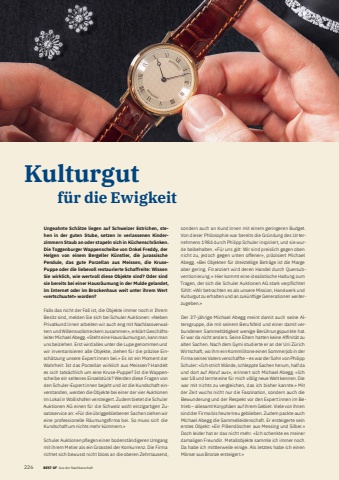 226 BEST OF Aus der NachbarschaftKulturgut f%u00fcr die EwigkeitUngeahnte Sch%u00e4tze liegen auf Schweizer Estrichen, stehen in der guten Stube, setzen in verlassenen Kinderzimmern Staub an oder stapeln sich in K%u00fcchenschr%u00e4nken. Die Toggenburger Wappenscheibe von Onkel Freddy, der Helgen von einem Bergeller K%u00fcnstler, die jurassische Pendule, das gute Porzellan aus Meissen, die KrusePuppe oder die liebevoll restaurierte Schaffreite: Wissen Sie wirklich, wie wertvoll diese Objekte sind? Oder sind sie bereits bei einer Hausr%u00e4umung in der Mulde gelandet, im Internet oder im Brockenhaus weit unter ihrem Wert %u00abvertschuutet%u00bb worden?Falls das nicht der Fall ist, die Objekte immer noch in Ihrem Besitz sind, melden Sie sich bei Schuler Auktionen: %u00abNeben Privatkund:innen arbeiten wir auch eng mit Nachlassverwaltern und Willensvollstreckern zusammen%u00bb, erkl%u00e4rt Gesch%u00e4ftsleiter Michael Abegg. %u00abSteht eine Hausr%u00e4umung an, kann man uns beiziehen. Erst wird alles unter die Lupe genommen und wir inventarisieren alle Objekte, ziehen f%u00fcr die pr%u00e4zise Einsch%u00e4tzung unsere Expert:innen bei.%u00bb Es ist ein Moment der Wahrheit: Ist das Porzellan wirklich aus Meissen? Handelt es sich tats%u00e4chlich um eine Kruse-Puppe? Ist die Wappenscheibe ein seltenes Einzelst%u00fcck? Werden diese Fragen von den Schuler-Expert:innen bejaht und ist die Kundschaft einverstanden, werden die Objekte bei einer der vier Auktionen im Lokal in Wollishofen versteigert. Zudem bietet die Schuler Auktionen AG einen f%u00fcr die Schweiz wohl einzigartigen Zusatzservice an: %u00abF%u00fcr die %u00fcbriggebliebenen Sachen ziehen wir eine professionelle R%u00e4umungsfi rma bei. So muss sich die Kundschaft um nichts mehr k%u00fcmmern.%u00bbSchuler Auktionen pflegen einen bodenst%u00e4ndigeren Umgang mit ihrem Metier als ein Grossteil der Konkurrenz. Die Firma richtet sich bewusst nicht bloss an die oberen Zehntausend, sondern auch an Kund:innen mit einem geringeren Budget. Von dieser Philosophie war bereits die Gr%u00fcndung des Unternehmens 1984 durch Philipp Schuler inspiriert, und sie wurde beibehalten. %u00abF%u00fcr uns gilt: Wir sind preislich gegen oben nicht zu, jedoch gegen unten offener%u00bb, pr%u00e4zisiert Michael Abegg. %u00abBei Objekten f%u00fcr dreistellige Betr%u00e4ge ist die Marge aber gering. Finanziert wird deren Handel durch Quersubventionierung.%u00bb Hier kommt eine idealistische Haltung zum Tragen, der sich die Schuler Auktionen AG stark verpflichtet f%u00fchlt: %u00abWir betrachten es als unsere Mission, Handwerk und Kulturgut zu erhalten und an zuk%u00fcnftige Generationen weiterzugeben.%u00bbDer 37-j%u00e4hrige Michael Abegg meint damit auch seine Altersgruppe, die mit seinem Berufsfeld und einer damit verbundenen Sammelt%u00e4tigkeit wenige Ber%u00fchrungspunkte hat. Er war da nicht anders. Seine Eltern hatten keine Affi nit%u00e4t zu alten Sachen. Nach dem Gymi studierte er an der Uni Z%u00fcrich Wirtschaft, wo ihm ein Kommilitone einen Sommerjob in der Firma seines Vaters verschaffte %u2013 es war der Sohn von Philipp Schuler: %u00abIch strich W%u00e4nde, schleppte Sachen herum, half da und dort auf Abruf aus%u00bb, erinnert sich Michael Abegg. %u00abIch war 18 und lernte eine f%u00fcr mich v%u00f6llig neue Welt kennen. Die war mit nichts zu vergleichen, das ich bisher kannte.%u00bb Mit der Zeit wuchs nicht nur die Faszination, sondern auch die Bewunderung und der Respekt vor den Expert:innen im Betrieb %u2013 allesamt Koryph%u00e4en auf ihrem Gebiet. Viele von ihnen sind der Firma bis heute treu geblieben. Zudem packte auch Michael Abegg die Sammelleidenschaft. Er ersteigerte sein erstes Objekt: %u00abEin Pillend%u00f6schen aus Messing und Silber.%u00bb Doch leider hat er das nicht mehr. %u00abIch schenkte es meiner damaligen Freundin. Metallobjekte sammle ich immer noch. Da habe ich mittlerweile einige. Als letztes habe ich einen M%u00f6rser aus Bronze ersteigert.%u00bb 2 BEST OF Portrait xxx
