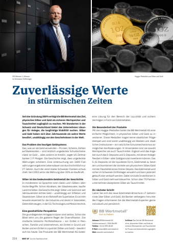 234 14 BEST OF BEST OF Portrait xxx Aus der NachbarschaftZuverl%u00e4ssige Werte in st%u00fcrmischen ZeitenAdresse: BB Wertmetall AGSolothurnstrasse 1, 2504 Biel BETelefon: +41 62 892 48 48 E-Mail: contact@bb-wertmetall.chWeb: www.bb-wertmetall.chIn K%u00fcrze: Das Ziel der BB Wertmetall ist es, physisches Silber und Gold als sicheren Wertspeicher und Tauschmittel f%u00fcr Private und Unternehmen zug%u00e4nglich zu machen.Seit der Gr%u00fcndung 2009 verfolgt die BB Wertmetall das Ziel, physisches Silber und Gold als sicheren Wert speicher und Tauschmittel zug%u00e4nglich zu machen. Mit Standorten in der Schweiz und Deutschland bietet das Unternehmen L%u00f6sungen f%u00fcr Anleger, die langfristige Stabilit%u00e4t suchen. Silber und Gold haben sich %u00fcber Jahrtausende als wahre Werte bew%u00e4hrt, unabh%u00e4ngig von den Geschehnissen in der Welt.Das Problem des heutigen GeldsystemsDas, was wir als Geld verwenden %u2013 M%u00fcnzen, Scheine, Zahlen auf Bankkonten %u2013 sind letztlich ungedeckte Schuldscheine. %u00abGeld ist Gold %u2026 alles andere ist Kredit%u00bb, sagte US-Zentralbanker J. P. Morgan. Die Geschichte zeigt, dass ungedeckte W%u00e4hrungen scheitern. Eine Untersuchung von 3400 Fiatw%u00e4hrungen ergab eine Lebensdauer von durchschnittlich nur 27 Jahren. Auch der einst starke Schweizer Franken schw%u00e4chelt. Seit 2002 verlor die W%u00e4hrung %u00fcber 30 % an Kaufkraft.Silber ist das bedeutendste Geldmetall der GeschichteIn mindestens 14 Sprachen sind %u00abGeld%u00bb und %u00abSilber%u00bb identische Begriffe. Schon Abraham, der Glaubensvater, kaufte Land mit Silber. Die Geschichte zeigt: Silber und Gold sind seit Jahrtausenden echtes Geld %u2013 unabh%u00e4ngig von Inflation und Staatskrisen. Silber ist ein Rohstoff der Superlative. Es ist mittlerweile essentiell f%u00fcr die Industrie und steckt in Solarzellen, Elektrofahrzeugen, in der 5G-Technologie und Medizintechnik.Eine ganzheitliche PerspektiveDie grundlegenden Anlageprinzipien sind zeitlos. Schon die Bibel lehrt uns die goldene Regel der Diversifi kation. Die dreifache biblische Portfoliotheorie %u2013 ein Drittel in Menschen, Familie und Unternehmen, ein Drittel in Grund und Boden und ein Drittel in Liquidit%u00e4t (Silber und Gold) %u2013 bew%u00e4hrt sich bis heute. Die Produkte der BB Wertmetall AG bieten eine L%u00f6sung f%u00fcr den Bereich der Liquidit%u00e4t und sichern Verm%u00f6gen in Form von Edelmetallen.Die Besonderheit der ProdukteMit den Haggai-Medaillen bietet die BB Wertmetall AG eine einfache M%u00f6glichkeit, in physisches Silber und Gold zu investieren. Diese Medaillen tragen keine staatlichen Pr%u00e4gestempel und sind somit unabh%u00e4ngig von Banken und staatlichen Institutionen %u2013 ein nat%u00fcrlicher Schutzmechanismus vor m%u00f6glichen Konfi szierungen. In Krisenzeiten sind sie sowohl Wertspeicher als auch Tauschmittel. Erg%u00e4nzt wird das Angebot durch das S-Depo sito und G-Deposito, mit denen Anleger flexibel in Silber- oder Goldgranulat investieren k%u00f6nnen. Das S-/G-Deposito ist die liquideste Form, Edelmetall zu besitzen und kombiniert die Vorteile von physischem Silber/Gold mit der Flexibilit%u00e4t eines Online-Depots. Das Edelmetall wird sicher im Schweizer Zollfreilager verwahrt und kann jederzeit gekauft oder verkauft werden. Dabei sind alle Investitionen in Silber und Gold mehrwertsteuerfrei. Schon %u00fcber 70 Partnerunternehmen akzeptieren Silber als Tauschmittel.Ihr n%u00e4chster SchrittLaden Sie sich die neue Edelmetall-Brosch%u00fcre %u00ab7 Geheimnisse %u00fcber Silber und Gold, die Banker verbergen%u00bb herunter. Bei Fragen informieren Sie die Wertmetall-Experten gerne individuell und pers%u00f6nlich.CEO Werner J. Ullmann im Schweizer ZollfreilagerHaggai-Medaillen aus Silber und Gold
