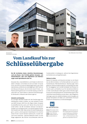 236 14 BEST OF BEST OF Portrait xxx Aus der NachbarschaftAdresse: BK Architekten GmbHHauptstrasse 9, 6260 Reiden LUTelefon: +41 62 758 22 66E-Mail: info@bkarchitekten.chWeb: www.bkarchitekten.chIn K%u00fcrze: Zu den Kernkompetenzen der BK Architekten geh%u00f6rt die Konzeptionierung und Realisierung von %u00f6ffentlichen, Industrie- und Gewerbebauten, Einfamilien- und Mehrfamilienh%u00e4usern, B%u00fcrogeb%u00e4uden und Spezialbauten aller Art. Vom Landkauf bis zurSchl%u00fcssel%u00fcbergabe Alexander Brun, Das %u00abMehlsecken%u00bb-Areal in ReidenGesch%u00e4ftsleiter und InhaberDie BK Architekten bieten s%u00e4mtliche Dienstleistungen rund ums Bauen. Zum Portfolio geh%u00f6ren Gewerbe- und Industriebauten, aber auch Eigenheime und %u00dcberbauungen sowie Spezialbauten aller Art.Alexander Brun, Gesch%u00e4ftsf%u00fchrer und Inhaber der BK Architekten in Reiden, ist Architekt mit Leib und Seele. Er hat die Firma, die 1974 von Heinrich R%u00f6%u00f6sli gegr%u00fcndet wurde, 2003 %u00fcbernommen und f%u00fchrte sie in die Gegenwart: 2017 nahm er eine Neuausrichtung vor, die mit einem neuen Firmen- und Markenauftritt gemeinsam mit der BK Holding und BK GU verbunden war. Damit bietet er s%u00e4mtliche Dienstleistungen f%u00fcr Neubauten, Umbauten oder Sanierungen an.Industrie und GewerbeEin wichtiges aktuelles Projekt sind die Erweiterungen des %u00abMehlsecken%u00bb-Areals in Reiden, wo unter anderem Firmen wie GEZE Schweiz, KNF Micro AG, Migros Outlet, Ornaplast Kunststofftechnik AG, Landi und F. Borner AG zu ihrer Kundschaft z%u00e4hlen. Die BK Architekten betreuen die Bauherrschaften aus architektonischer und bauleitungstechnischer Sicht bereits seit 1985. Was einmal mit einem Geb%u00e4ude begann, wurde zu einem grossen Gewerbepark mit verschiedenen Firmen. Da der Standort weiterwuchs, musste man nach innen verdichten %u2013 gewisse Geb%u00e4ude wurden um eine Etage aufgestockt. Bei solchen Industriebauten steht die Funktionalit%u00e4t im Vordergrund, w%u00e4hrend bei Eigenheimen die %u00c4sthetik eine wichtige Rolle spielt. Wohnen im AlterBauten f%u00fcr Gewerbe und Industrie sind aber nur ein Standbein der BK Architekten. Im Portfolio befi nden sich auch Einfamilienh%u00e4user, Mehrfamilienh%u00e4user, %u00dcberbauungen, B%u00fcrogeb%u00e4ude, landwirtschaftliche Bauten und Spezialbauten aller Art. So engagieren sich die BK Architekten als Pioniere im Kanton Luzern und Solothurn auch f%u00fcr das betreute Wohnen im Alter. Solche Bauten stellen ganz andere Anforderungen. So braucht es beispielsweise ein Sicherheitskonzept f%u00fcr Barrierefreiheit sowie die N%u00e4he zu einem Alters- oder Pflegeheim. Doch egal, was es ist, die BK Architekten sind mit Sorgfalt und grosser Kompetenz mit dabei und unterst%u00fctzen ihre Kundschaft vom Landkauf bis zur Schl%u00fcssel%u00fcbergabe.