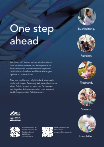 Solidis Revisions AGSolidis Treuhand AGReviCare GmbH 4600 Oltenwww.solidis.chMerki Treuhand AG5400 Badenwww.merkitreuhand.chA Worldwide Alliance of Independent Accounting FirmsMEMBEROne step aheadSeit %u00fcber 100 Jahren setzen wir alles daran, Dich als Unternehmer und Privatperson in finanziellen und steuerlichen Belangen mit qualitativ hochstehenden Dienstleistungen optimal zu unterst%u00fctzen.Dies war und ist nur m%u00f6glich dank einer weitund umsichtigen Beratung. Wir versuchen immer einen Schritt voraus zu sein: mit Fachwissen, mit digitalen Arbeitsmethoden oder etwa mit bed%u00fcrfnisgerechten Publikationen.Buchhaltung.Revision.Treuhand.Steuern.Immobilien.