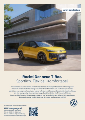 Ihr Volkswagen Partner der Region AarauAFM Stadtgarage AGDelfterstrasse 16b, 5001 AarauTel. +41 62 822 20 41 (Verkauf)Tel. +41 62 822 55 12 (Kundendienst)partner.volkswagen.ch/afmstadtgarage Rockt! Der neue T-Roc. Sportlich. Flexibel. Komfortabel.Die komplett neu entwickelte zweite Generation des Volkswagen Bestsellers T-Roc zeigt sich mit einem ausdrucksstarken Design und innovativen Antrieben. Zum hochwertigen Interieur geh%u00f6rt ein neu designtes Cockpit, ein grosser Infotainment-Screen und eine Ambientebeleuchtung, die eine loungeartige Atmosph%u00e4re erzeugt. Zus%u00e4tzlich bietet der T-Roc mehr Platz imInnen- und Kofferraum. Neue Assistenzsysteme und Technologien aus h%u00f6heren Fahrzeugklassen komplettieren das Modell. Kommen Sie vorbei, wir freuen uns auf Sie!Jetzt entdecken