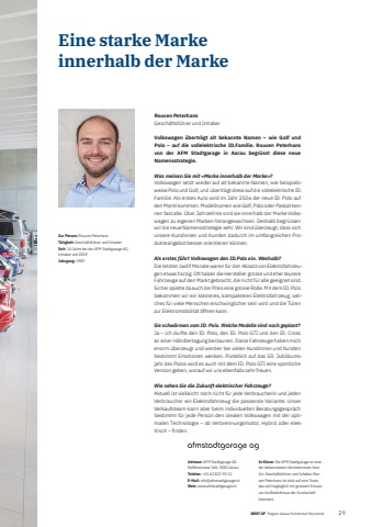 BEST OF Region Aarau-Suhrental-Wynental BEST OF Bildstrecke 294Zur Person: Rouven PeterhansT%u00e4tigkeit: Gesch%u00e4ftsf%u00fchrer und InhaberSeit: 14 Jahre bei der AFM Stadtgarage AG, Inhaber seit 2019Jahrgang: 1987Rouven PeterhansGesch%u00e4ftsf%u00fchrer und InhaberVolkswagen %u00fcbertr%u00e4gt alt bekannte Namen %u2013 wie Golf und Polo %u2013 auf die vollelektrische ID.Familie. Rouven Peterhans von der AFM Stadtgarage in Aarau begr%u00fcsst diese neue Namensstrategie.Was meinen Sie mit %u00abMarke innerhalb der Marke%u00bb?Volkswagen setzt wieder auf alt bekannte Namen, wie beispielsweise Polo und Golf, und %u00fcbertr%u00e4gt diese auf die vollelektrische ID. Familie. Als erstes Auto wird im Jahr 2026 der neue ID. Polo auf den Markt kommen. Modellnamen wie Golf, Polo oder Passat kennen fast alle. %u00dcber Jahrzehnte sind sie innerhalb der Marke Volkswagen zu eigenen Marken herangewachsen. Deshalb begr%u00fcssen wir die neue Namensstrategie sehr. Wir sind %u00fcberzeugt, dass sich unsere Kundinnen und Kunden dadurch im umfangreichen Produkteangebot besser orientieren k%u00f6nnen.Als erstes f%u00fchrt Volkswagen den ID.Polo ein. Weshalb?Die letzten zw%u00f6lf Monate waren f%u00fcr den Absatz von Elektrofahrzeugen etwas harzig. Oft haben die Hersteller grosse und eher teurere Fahrzeuge auf den Markt gebracht, die nicht f%u00fcr alle geeignet sind. Sicher spielte da auch der Preis eine grosse Rolle. Mit dem ID. Polo bekommen wir ein kleineres, kompakteres Elektrofahrzeug, welches f%u00fcr viele Menschen erschwinglicher sein wird und die T%u00fcren zur Elektromobilit%u00e4t %u00f6ffnen kann.Sie schw%u00e4rmen vom ID. Polo. Welche Modelle sind noch geplant? Ja %u2013 ich durfte den ID. Polo, den ID. Polo GTI und den ID. Cross an einer H%u00e4ndlertagung bestaunen. Diese Fahrzeuge haben mich enorm %u00fcberzeugt und werden bei vielen Kundinnen und Kunden bestimmt Emotionen wecken. P%u00fcnktlich auf das 50. Jubil%u00e4umsjahr des Polos wird es auch mit dem ID. Polo GTI eine sportliche Version geben, worauf wir uns ebenfalls sehr freuen.Wie sehen Sie die Zukunft elektrischer Fahrzeuge?Aktuell ist vielleicht noch nicht f%u00fcr jede Verbraucherin und jeden Verbraucher ein Elektrofahrzeug die passende Variante. Unser Verkaufsteam kann aber beim individuellen Beratungsgespr%u00e4ch bestimmt f%u00fcr jede Person den idealen Volkswagen mit der optimalen Technologie %u2013 ob Verbrennungsmotor, Hybrid oder elektrisch %u2013 fi nden.Eine starke Marke innerhalb der MarkeAdresse: AFM Stadtgarage AGDelfterstrasse 16b, 5001 AarauTelefon: +41 62 822 55 12E-Mail: info@afmstadtgarage.chWeb: www.afmstadtgarage.chIn K%u00fcrze: Die AFM Stadtgarage ist eine der bekanntesten Vertreterinnen ihrer Art. Gesch%u00e4ftsf%u00fchrer und Inhaber Rouven Peterhans ist stolz auf sein Team, das sich tagt%u00e4glich mit grossem Einsatz um die Bed%u00fcrfnisse der Kundschaft k%u00fcmmert.