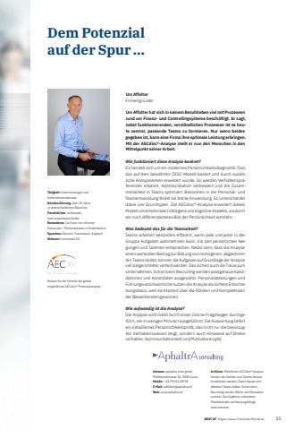 BEST OF Region Aarau-Suhrental-Wynental BEST OF Interview 352Adresse: aphaltra-trust gmbhM%u00fchlemattstrasse 56, 5000 AarauMobile: +41 79 653 09 28E-Mail: uaffolter@aphaltra.chWeb: www.aphaltra.chIn K%u00fcrze: Mithilfe der AECdisc%u00ae-Analyse k%u00f6nnen die St%u00e4rken und Talente herauskristallisiert werden. Damit lassen sich effektive Teams bilden. Schon beim Recruiting werden Werte und Motivation sichtbar. Das Ergebnis: zufriedene Mitarbeitende und leistungsf%u00e4hige Unternehmen.T%u00e4tigkeit: Interimmanager und UnternehmensberaterBerufserfahrung: %u00fcber 35 Jahre in unterschiedlichen BranchenPers%u00f6nliches: verheiratet, zwei erwachsene KinderBesonderes: Co-Autor von %u00abHuman Resources %u2013 Personalwesen in Krisenzeiten%u00bbSprachen: Deutsch, Franz%u00f6sisch, EnglischWohnort: Lommiswil SONutzen Sie die Vorteile der global eingef%u00fchrten AECdisc%u00ae-Potenzialanalyse.Dem Potenzial auf der Spur %u2026Urs AffolterFirmengr%u00fcnderUrs Affolter hat sich in seinem Berufsleben viel mit Prozessen rund um Finanz- und Controllingsysteme besch%u00e4ftigt. Er sagt, nebst funktionierenden, verst%u00e4ndlichen Prozessen ist es heute zentral, passende Teams zu formieren. Nur wenn beides gegeben ist, kann eine Firma ihre optimale Leistung erbringen. Mit der AECdisc%u00ae-Analyse stellt er nun den Menschen in den Mittelpunkt seiner Arbeit. Wie funktioniert diese Analyse konkret?Es handelt sich um ein modernes Pers%u00f6nlichkeitsdiagnostik-Tool, das auf dem bew%u00e4hrten DISC-Modell basiert und durch zus%u00e4tzliche Komponenten erweitert wurde. So werden Verhaltenspr%u00e4ferenzen erkannt, Kommunikation verbessert und die Zusammenarbeit in Teams optimiert. Besonders in der Personal- und Teamentwicklung fi ndet sie breite Anwendung. Es unterscheidet dabei vier Grundtypen. Die AECdisc%u00ae-Analyse erweitert dieses Modell um emotionale Intelligenz und kognitive Aspekte, wodurch ein noch differenzierteres Bild der Pers%u00f6nlichkeit entsteht. Was bedeutet das f%u00fcr die Teamarbeit?Teams arbeiten besonders effi zient, wenn jede und jeder in der Gruppe Aufgaben wahrnehmen kann, die den pers%u00f6nlichen Neigungen und Talenten entsprechen. Nebst dem, dass die Analyse einen wertvollen Beitrag zur Bildung von homogenen, abgestimmten Teams leistet, k%u00f6nnen die Aufgaben auf Grundlage der Analyse viel zielgerichteter verteilt werden. Das sichert auch die Treue zum Unternehmen. Schon beim Recruiting werden passgenaue Kandidatinnen und Kandidaten ausgew%u00e4hlt. Personalabteilungen und F%u00fchrungsverantwortliche nutzen die Analyse als sichere Entscheidungsbasis, weil sie Klarheit %u00fcber die St%u00e4rken und Kompetenzen der Bewerbenden gewinnen.Wie aufwendig ist die Analyse? Die Analyse wird meist durch einen Online-Fragebogen durchgef%u00fchrt, der in wenigen Minuten ausgef%u00fcllt ist. Die Auswertung liefert ein detailliertes Pers%u00f6nlichkeitsprofi l, das nicht nur die bevorzugten Verhaltensweisen zeigt, sondern auch Hinweise auf Stressverhalten, Kommunikationsstil und Motivatoren gibt.