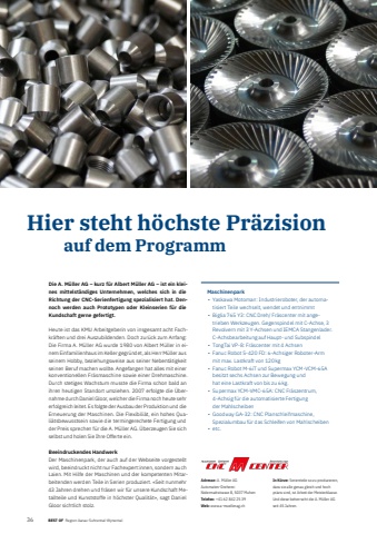 361 BEST OF BEST OF Portrait xxx Region Aarau-Suhrental-WynentalHier steht h%u00f6chste Pr%u00e4zision auf dem ProgrammAdresse: A. M%u00fcller AGAutomaten-DrehereiNidermattstrasse 8, 5037 MuhenTelefon: +41 62 842 25 39Web: www.a-muellerag.chIn K%u00fcrze: Serienteile so zu produzieren, dass sie alle genau gleich und hoch pr%u00e4zis sind, ist Arbeit der Meisterklasse. Und diese beherrscht die A. M%u00fcller AG seit 45 Jahren. Die A. M%u00fcller AG %u2013 kurz f%u00fcr Albert M%u00fcller AG %u2013 ist ein kleines mittelst%u00e4ndiges Unternehmen, welches sich in die Richtung der CNC-Serienfertigung spezialisiert hat. Dennoch werden auch Prototypen oder Kleinserien f%u00fcr die Kundschaft gerne gefertigt.Heute ist das KMU Arbeitgeberin von insgesamt acht Fachkr%u00e4ften und drei Auszubildenden. Doch zur%u00fcck zum Anfang: Die Firma A.%u00a0M%u00fcller%u00a0AG wurde 1980 von Albert M%u00fcller in einem Einfamilienhaus im Keller gegr%u00fcndet, als Herr M%u00fcller aus seinem Hobby, beziehungsweise aus seiner Nebent%u00e4tigkeit seinen Beruf machen wollte. Angefangen hat alles mit einer konventionellen Fr%u00e4smaschine sowie einer Drehmaschine. Durch stetiges Wachstum musste die Firma schon bald an ihren heutigen Standort umziehen. 2007 erfolgte die %u00dcbernahme durch Daniel Gloor, welcher die Firma noch heute sehr erfolgreich leitet. Es folgte der Ausbau der Produktion und die Erneuerung der Maschinen. Die Flexibili%u00e4t, ein hohes Quali%u00e4tsbewusstsein sowie die termingerechete Fertigung und der Preis sprechen f%u00fcr die A.%u00a0M%u00fcller%u00a0AG. %u00dcberzeugen Sie sich selbst und holen Sie Ihre Offerte ein.Beeindruckendes HandwerkDer Maschinenpark, der auch auf der Webseite vorgestellt wird, beeindruckt nicht nur Fachexpert:innen, sondern auch Laien. Mit Hilfe der Maschinen und der kompetenten Mitarbeitenden werden Teile in Serien produziert. %u00abSeit nunmehr 43%u00a0Jahren drehen und fr%u00e4sen wir f%u00fcr unsere Kundschaft Metallteile und Kunststoffe in h%u00f6chster Qualit%u00e4t%u00bb, sagt Daniel Gloor sichtlich stolz.Maschinenpark%u2022 Yaskawa Motoman: Industrieroboter, der automatisiert Teile wechselt, wendet und entnimmt%u2022 Biglia 765 Y3: CNC Dreh/ Fr%u00e4scenter mit angetrieben Werkzeugen. Gegenspindel mit C-Achse, 3 Revolvern mit 3 Y-Achsen und IEMCA Stangenlader. C-Achsbearbeitung auf Haupt- und Subspindel%u2022 TongTai VP-8: Fr%u00e4scenter mit 4 Achsen%u2022 Fanuc Robot S-420 FD: 6-Achsiger Roboter-Arm mit max. Lastkraft von 120 kg%u2022 Fanuc Robot M-6iT und Supermax YCM-VCM-65A besitzt sechs Achsen zur Bewegung und hat eine Lastkraft von bis zu 6 kg.%u2022 Supermax YCM-VMC-65A: CNC Fr%u00e4szentrum, 4-Achsig f%u00fcr die automatisierte Fertigung der Mahlscheiben%u2022 Goodway GA-32: CNC Planschleifmaschine, Spezialumbau f%u00fcr das Schleifen von Mahlscheiben%u2022 etc.