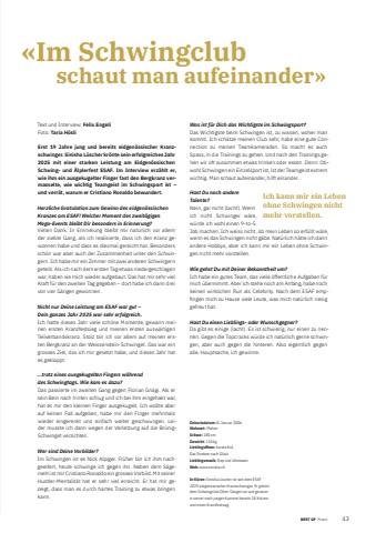 BEST OF BEST OF Promi 432Text und Intervie Felix Engeli Foto: Taria H%u00f6sliErst 19 Jahre jung und bereits eidgen%u00f6ssischer Kranzschwinger. Sinisha L%u00fcscher kr%u00f6nte sein erfolgreiches Jahr 2025 mit einer starken Leistung am Eidgen%u00f6ssischen Schwing- und %u00c4lplerfest ESAF. Im Interview erz%u00e4hlt er, wie ihm ein ausgekugelter Finger fast den Bergkranz vermasselte, wie wichtig Teamgeist im Schwingsport ist %u2013 und verr%u00e4t, warum er Cristiano Ronaldo bewundert.Herzliche Gratulation zum Gewinn des eidgen%u00f6ssischen Kranzes am ESAF! Welcher Moment des zweit%u00e4gigen Mega-Events bleibt Dir besonders in Erinnerung?Vielen Dank. In Erinnerung bleibt mir nat%u00fcrlich vor allem der siebte Gang, als ich realisierte, dass ich den Kranz gewonnen habe und dass es diesmal gereicht hat. Besonders sch%u00f6n war aber auch der Zusammenhalt unter den Schwingern. Ich habe mir ein Zimmer mit zwei anderen Schwingern geteilt. Als ich nach dem ersten Tag etwas niedergeschlagen war, haben sie mich wieder aufgebaut. Das hat mir sehr viel Kraft f%u00fcr den zweiten Tag gegeben %u2013 dort habe ich dann drei von vier G%u00e4ngen gewonnen.Nicht nur Deine Leistung am ESAF war gut %u2013 Dein ganzes Jahr 2025 war sehr erfolgreich.Ich hatte dieses Jahr viele sch%u00f6ne Momente, gewann meinen ersten Kranzfestsieg und meinen ersten ausw%u00e4rtigen Teilverbandskranz. Stolz bin ich vor allem auf meinen ersten Bergkranz an der Weissenstein-Schwinget. Das war ein grosses Ziel, das ich mir gesetzt habe, und dieses Jahr hat es geklappt....trotz eines ausgekugelten Fingers w%u00e4hrend des Schwingtags. Wie kam es dazu?Das passierte im zweiten Gang gegen Florian Gn%u00e4gi. Als er sein Bein nach hinten schlug und ich bei ihm eingehakt war, hat es mir den kleinen Finger ausgekugelt. Ich wollte aber auf keinen Fall aufgeben, habe mir den Finger mehrmals wieder eingerenkt und einfach weiter geschwungen. Leider musste ich dann wegen der Verletzung auf die Br%u00fcnigSchwinget verzichten.Wer sind Deine Vorbilder?Im Schwingen ist es Nick Alpiger. Fr%u00fcher bin ich ihm nachgeeifert, heute schwinge ich gegen ihn. Neben dem S%u00e4gemehl ist mir Cristiano Ronaldo ein grosses Vorbild. Mit seiner Hustler-Mentalit%u00e4t hat er sehr viel erreicht. Er hat mir gezeigt, dass man es durch hartes Training zu etwas bringen kann. Was ist f%u00fcr Dich das Wichtigste im Schwingsport?Das Wichtigste beim Schwingen ist, zu wissen, woher man kommt. Ich sch%u00e4tze meinen Club sehr, habe eine gute Connection zu meinen Teamkameraden. So macht es auch Spass, in die Trainings zu gehen. Und nach den Trainings gehen wir oft zusammen etwas trinken oder essen. Denn: Obwohl Schwingen ein Einzelsport ist, ist der Teamgeist extrem wichtig. Man schaut aufeinander, hilft einander.Hast Du noch andere Talente? Nein, gar nicht (lacht). Wenn ich nicht Schwinger w%u00e4re, w%u00fcrde ich wohl einen 9-to-5 Job machen. Ich weiss nicht, ob mein Leben so erf%u00fcllt w%u00e4re, wenn es das Schwingen nicht g%u00e4be. Nat%u00fcrlich h%u00e4tte ich dann andere Hobbys, aber ich kann mir ein Leben ohne Schwingen nicht mehr vorstellen.Wie gehst Du mit Deiner Bekanntheit um? Ich habe ein gutes Team, das viele %u00f6ffentliche Aufgaben f%u00fcr mich %u00fcbernimmt. Aber ich stehe noch am Anfang, habe noch keinen wirklichen Run als Celebrity. Nach dem ESAF empfi ngen mich zu Hause viele Leute, was mich nat%u00fcrlich riesig gefreut hat.Hast Du einen Lieblings- oder Wunschgegner?Da gibt es einige (lacht). Es ist schwierig, nur einen zu nennen. Gegen die Topcracks w%u00fcrde ich nat%u00fcrlich gerne schwingen, aber auch gegen die hinteren. Also eigentlich gegen alle. Hauptsache, ich gewinne.%u00abIm Schwingclub schaut man aufeinander%u00bbIch kann mir ein Leben ohne Schwingen nicht mehr vorstellen.Geburtsdatum: 8. Januar 2006Wohnort: MuhenGr%u00f6sse: 180 cmGewicht: 110 kgLieblingsfi lme: Karate Kid, Das Streben nach Gl%u00fcckLieblingsmusik: Rap und AfrobeatsWeb: www.sinisha.chIn K%u00fcrze: Sinisha L%u00fcscher ist seit dem ESAF 2025 eidgen%u00f6ssischer Kranzschwinger. Er geh%u00f6rt dem Schwingclub Olten-G%u00f6sgen an und gewann in seiner noch jungen Karriere bereits 18%u00a0Kr%u00e4nze und einen Kranzfestsieg.