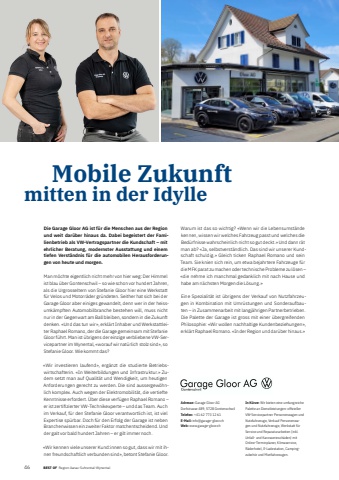 4632 BEST OF Portrait xxx Mobile Zukunft mitten in der Idylle Die Garage Gloor AG ist f%u00fcr die Menschen aus der Region und weit dar%u00fcber hinaus da. Dabei begeistert der Familienbetrieb als VW-Vertragspartner die Kundschaft %u2013 mit ehrlicher Beratung, modernster Ausstattung und einem tiefen Verst%u00e4ndnis f%u00fcr die automobilen Herausforderungen von heute und morgen.Man m%u00f6chte eigentlich nicht mehr von hier weg: Der Himmel ist blau %u00fcber Gontenschwil %u2013 so wie schon vor hundert Jahren, als die Urgrosseltern von Stefanie Gloor hier eine Werkstatt f%u00fcr Velos und Motorr%u00e4der gr%u00fcndeten. Seither hat sich bei der Garage Gloor aber einiges gewandelt, denn wer in der heissumk%u00e4mpften Automobilbranche bestehen will, muss nicht nur in der Gegenwart am Ball bleiben, sondern in die Zukunft denken. %u00abUnd das tun wir%u00bb, erkl%u00e4rt Inhaber und Werkstattleiter Raphael Romano, der die Garage gemeinsam mit Stefanie Gloor f%u00fchrt. Man ist %u00fcbrigens der einzige verbliebene VW-Servicepartner im Wynental, %u00abworauf wir nat%u00fcrlich stolz sind%u00bb, so Stefanie Gloor. Wie kommt das? %u00abWir investieren laufend%u00bb, erg%u00e4nzt die studierte Betriebswirtschafterin. %u00abIn Weiterbildungen und Infrastruktur.%u00bb Zudem setzt man auf Qualit%u00e4t und Wendigkeit, um heutigen Anforderungen gerecht zu werden. Die sind aussergew%u00f6hnlich komplex. Auch wegen der Elektromobilit%u00e4t, die vertiefte Kenntnisse erfordert. %u00dcber diese verf%u00fcgen Raphael Romano %u2013 er ist zertifi zierter VW-Technikexperte %u2013 und das Team. Auch im Verkauf, f%u00fcr den Stefanie Gloor verantwortlich ist, ist viel Expertise sp%u00fcrbar. Doch f%u00fcr den Erfolg der Garage ist neben Branchenwissen ein zweiter Faktor matchentscheidend. Und der galt vor bald hundert Jahren %u2013 er gilt immer noch. %u00abWir kennen viele unserer Kund:innen so gut, dass wir mit ihnen freundschaftlich verbunden sind%u00bb, betont Stefanie Gloor. Warum ist das so wichtig? %u00abWenn wir die Lebensumst%u00e4nde kennen, wissen wir welches Fahrzeug passt und welches die Bed%u00fcrfnisse wahrscheinlich nicht so gut deckt.%u00bb Und dann r%u00e4t man ab? %u00abJa, selbstverst%u00e4ndlich. Das sind wir unserer Kundschaft schuldig.%u00bb Gleich ticken Raphael Romano und sein Team. Sie knien sich rein, um etwa bejahrtere Fahrzeuge f%u00fcr die MFK parat zu machen oder technische Probleme zu l%u00f6sen %u2013 %u00abdie nehme ich manchmal gedanklich mit nach Hause und habe am n%u00e4chsten Morgen die L%u00f6sung.%u00bb Eine Spezialit%u00e4t ist %u00fcbrigens der Verkauf von Nutzfahrzeugen in Kombination mit Umr%u00fcstungen und Sonderaufbauten %u2013 in Zusammenarbeit mit langj%u00e4hrigen Partnerbetrieben. Die Palette der Garage ist gross mit einer %u00fcbergreifenden Philo sophie: %u00abWir wollen nachhaltige Kundenbeziehungen%u00bb, erkl%u00e4rt Raphael Romano. %u00abIn der Region und dar%u00fcber hinaus.%u00bb Adresse: Garage Gloor AG Dorfstrasse 489, 5728 GontenschwilTelefon: +41 62 773 12 61E-Mail: info@garage-gloor.chWeb: www.garage-gloor.chIn K%u00fcrze: Wir bieten eine umfangreiche Palette an Dienstleistungen: offi zieller VW-Servicepartner Personenwagen und Nutzfahrzeuge, Verkauf Personenwagen und Nutzfahrzeuge, Werkstatt f%u00fcr Service und Reparaturarbeiten (inkl. Unfall- und Karosseriesch%u00e4den) mit Online-Terminplaner, Klimaservice, R%u00e4derhotel, E-Ladestation, Campingzubeh%u00f6r und Mietfahrzeugen. BEST OF Region Aarau-Suhrental-Wynental